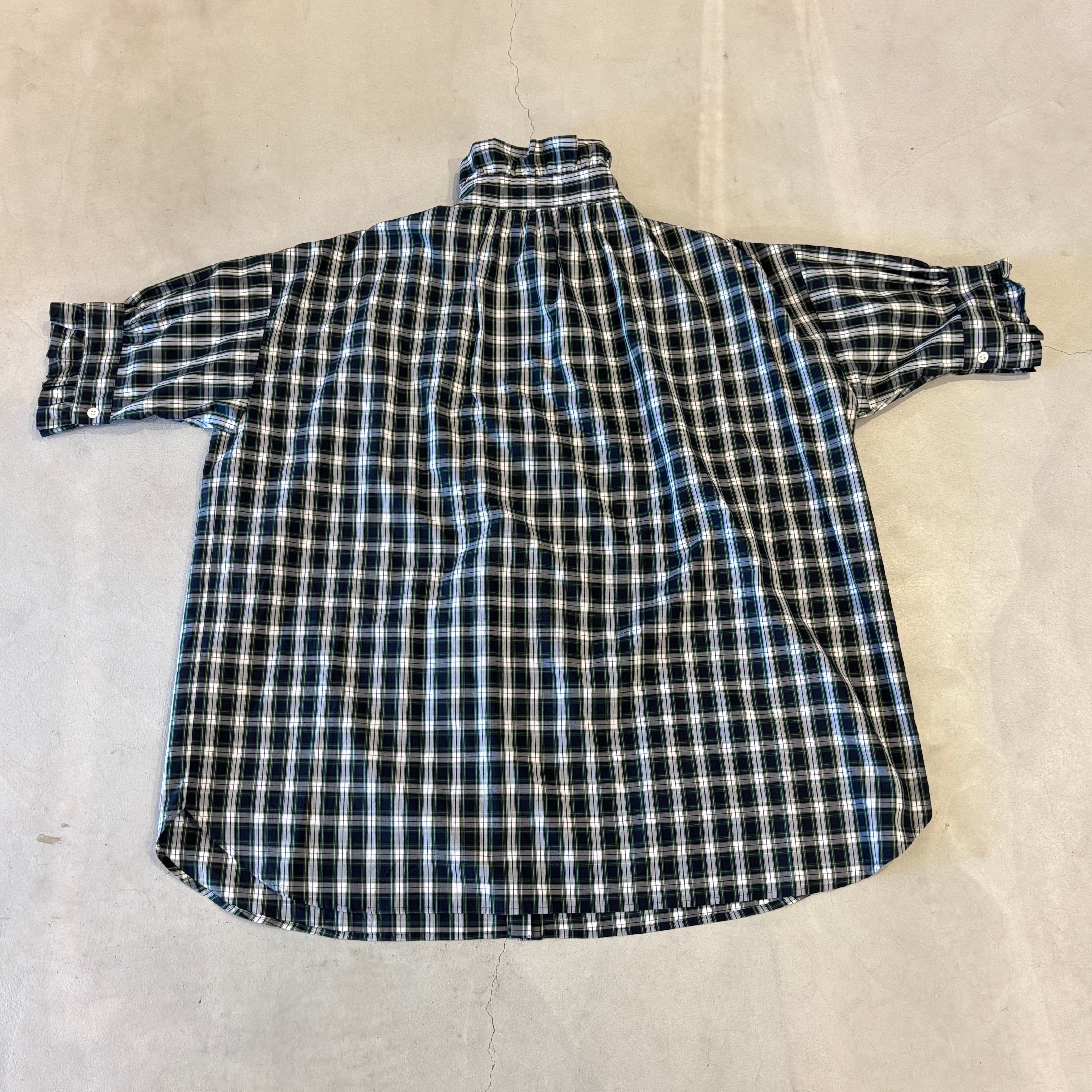 スタンドカラーな衿に、フロント、お袖にふんだんのフリルをあしらったブラウス。