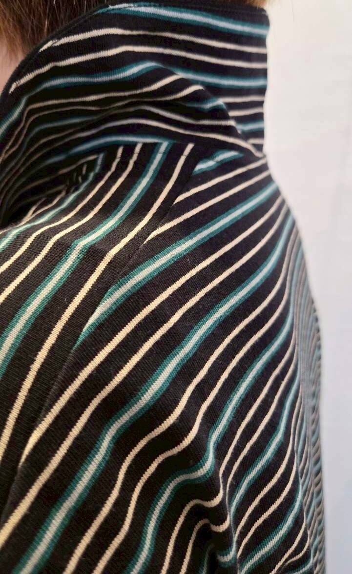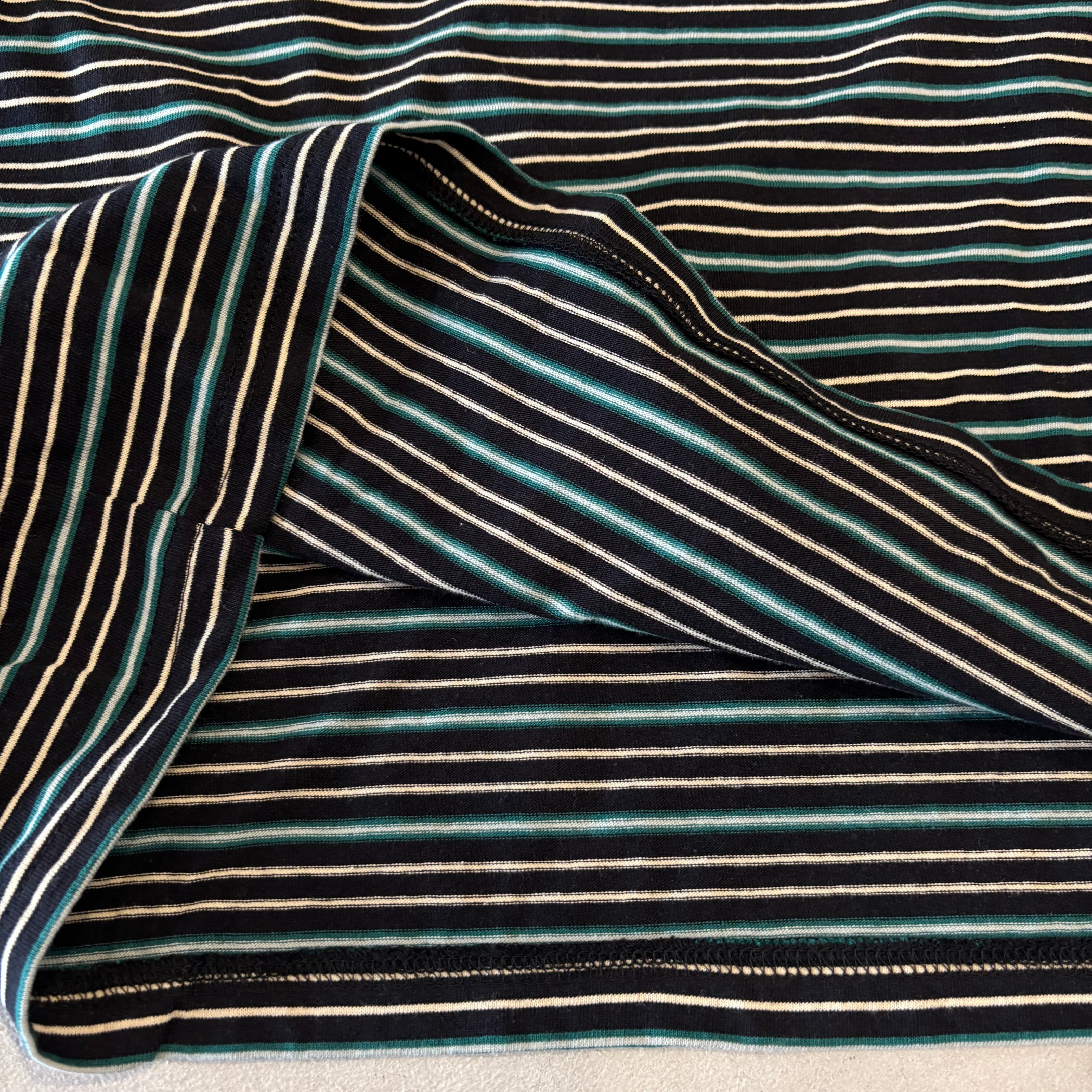 大人が着やすい落ち着いた配色の細ボーダー柄で、スタイリングに鮮度をプラスしてくれるアイテムです。艶のあるブラックニッケルのドットボタン、袖のストライプ柄がアクセントになっています。