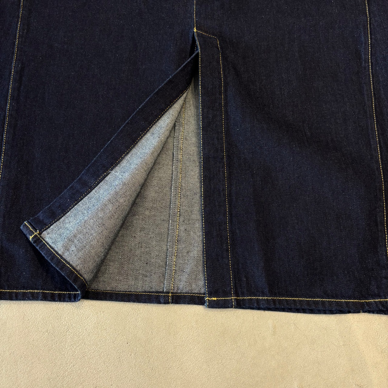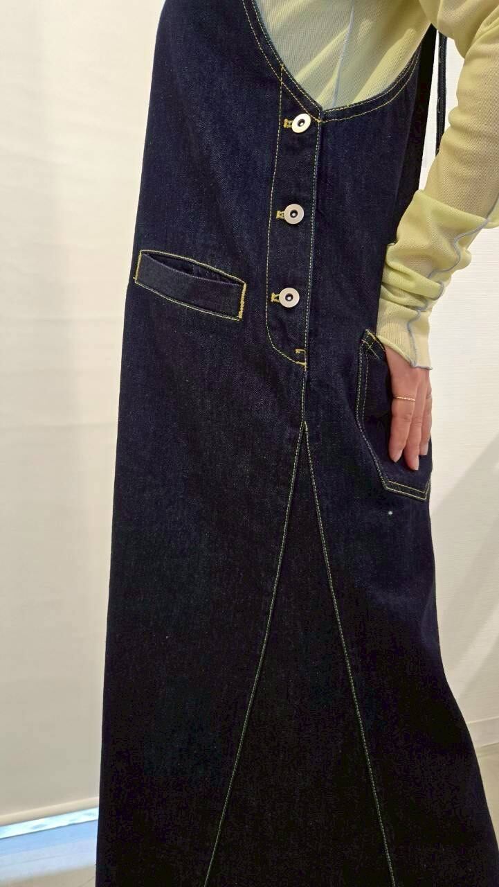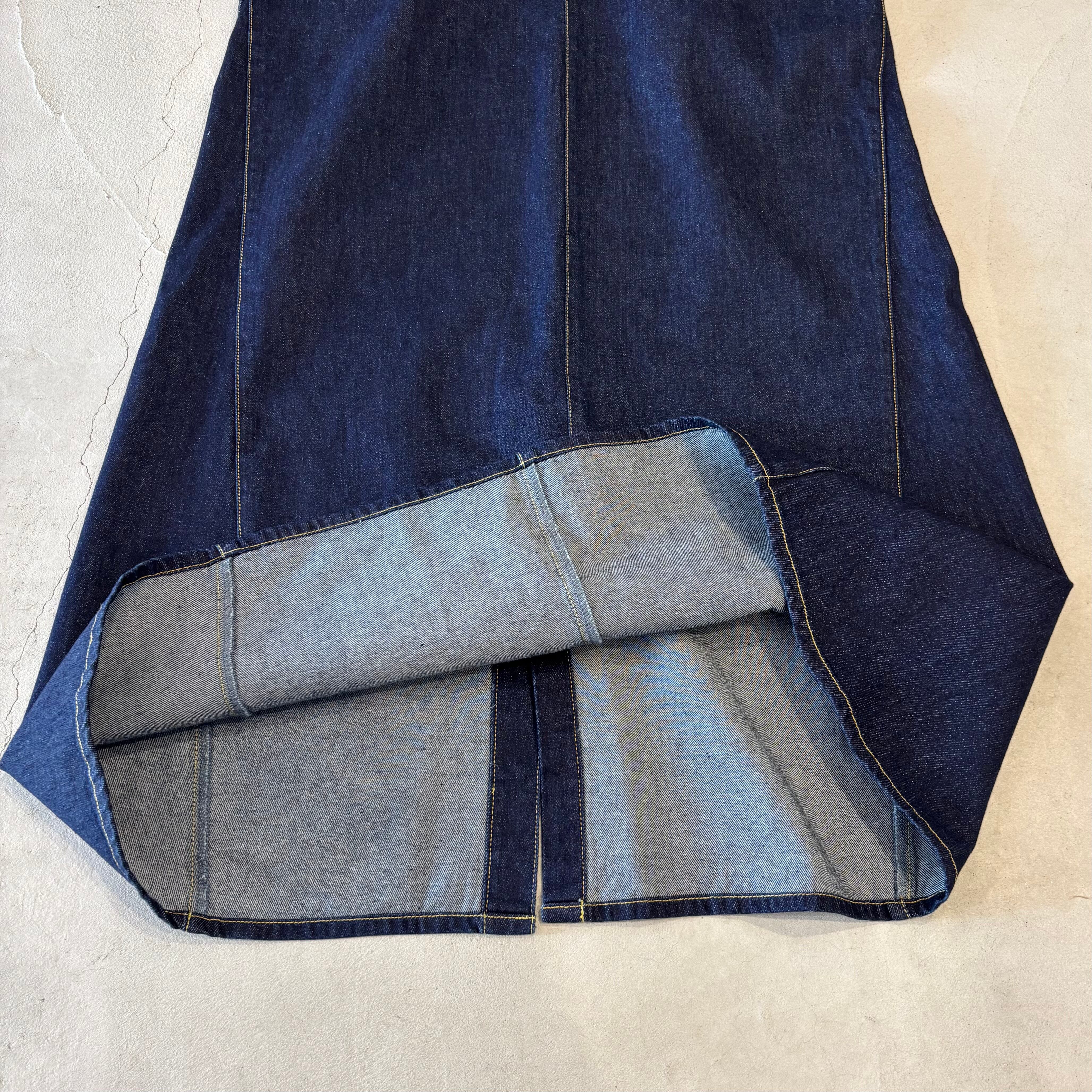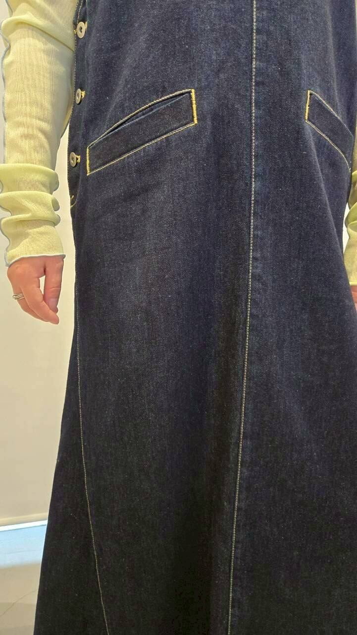カジュアルに偏りがちなデニムジャンスカをすっきりしたVネック、フレアシルエットで女性らしく仕上げました。ベンツスリットで足捌きも抜群です。
