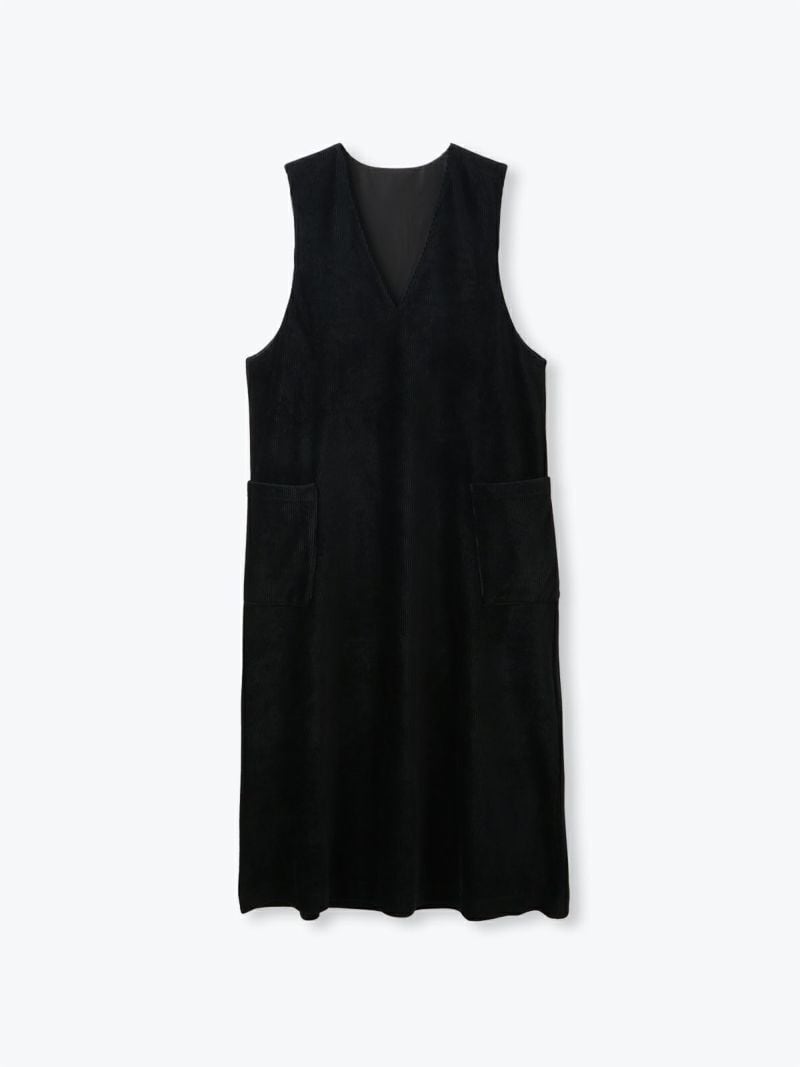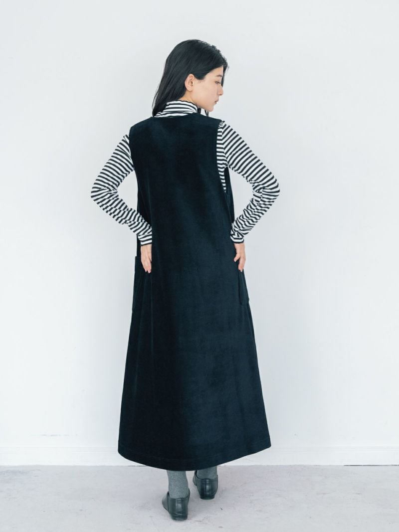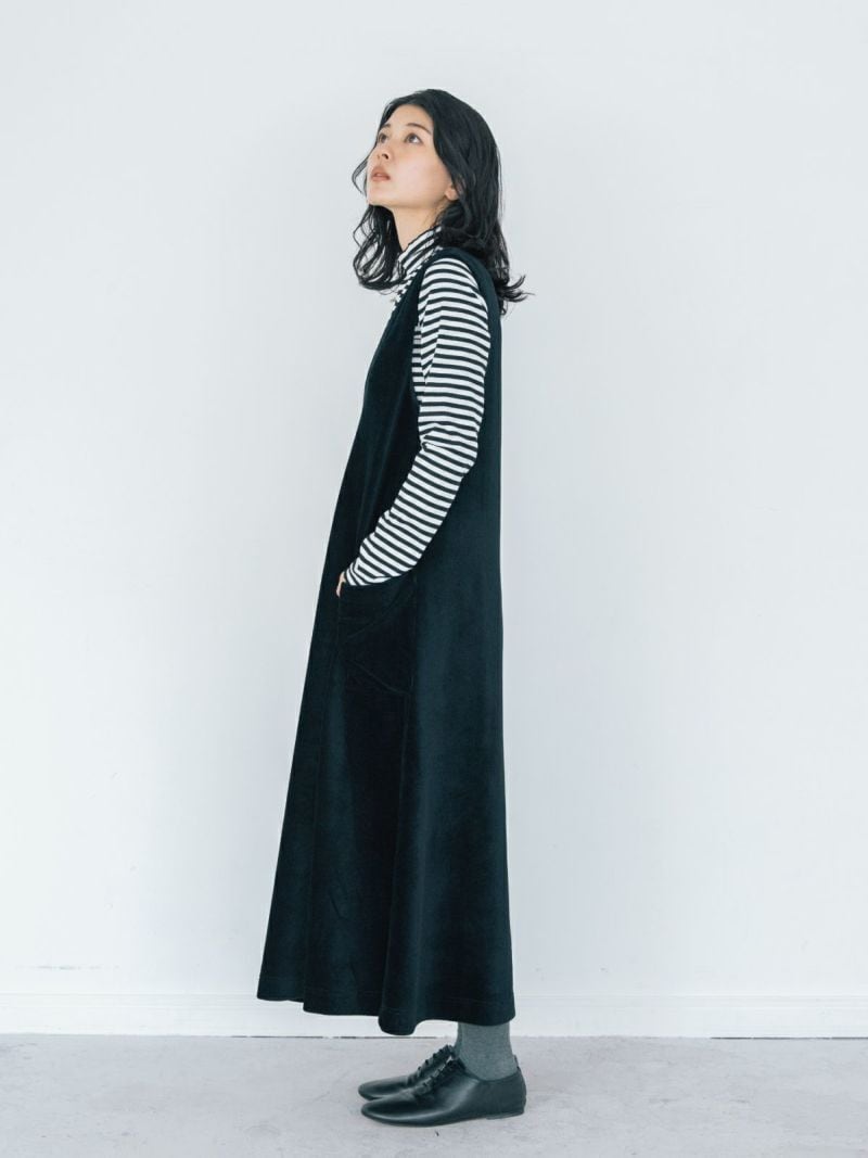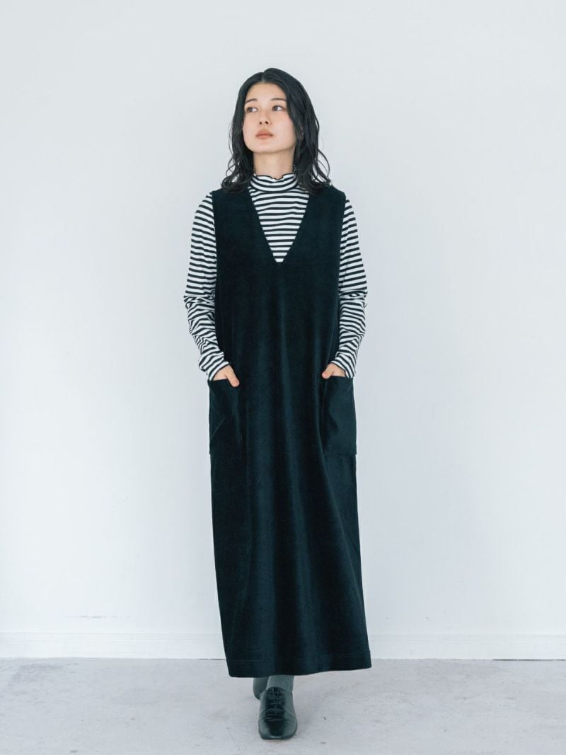 すっきりとしたVネックがレイヤードを引き立てるジャンパースカート。