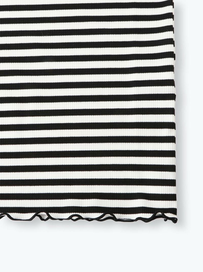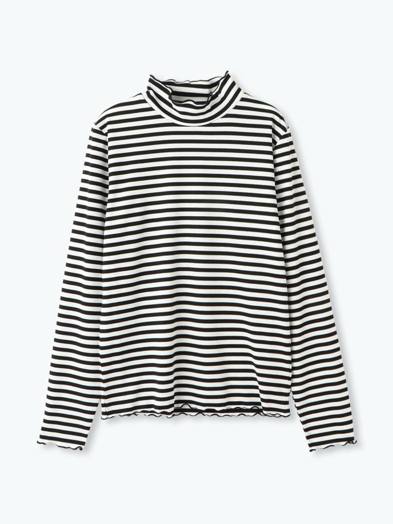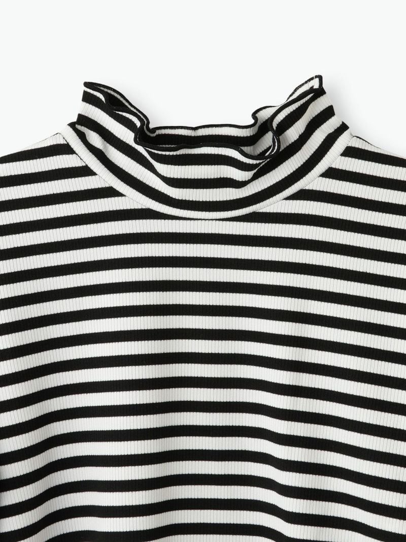 ボーダー柄が目を引くハイネックプルオーバー。