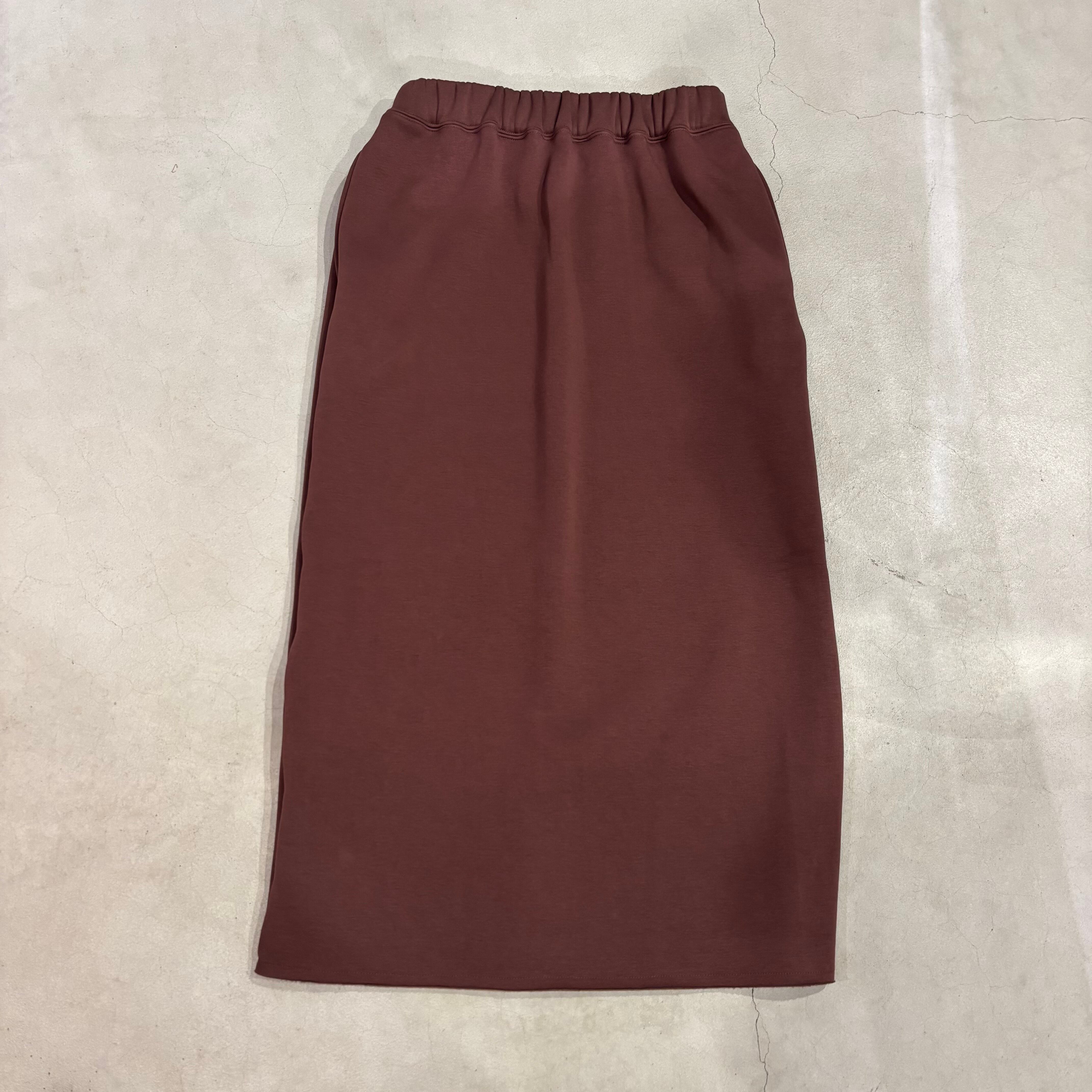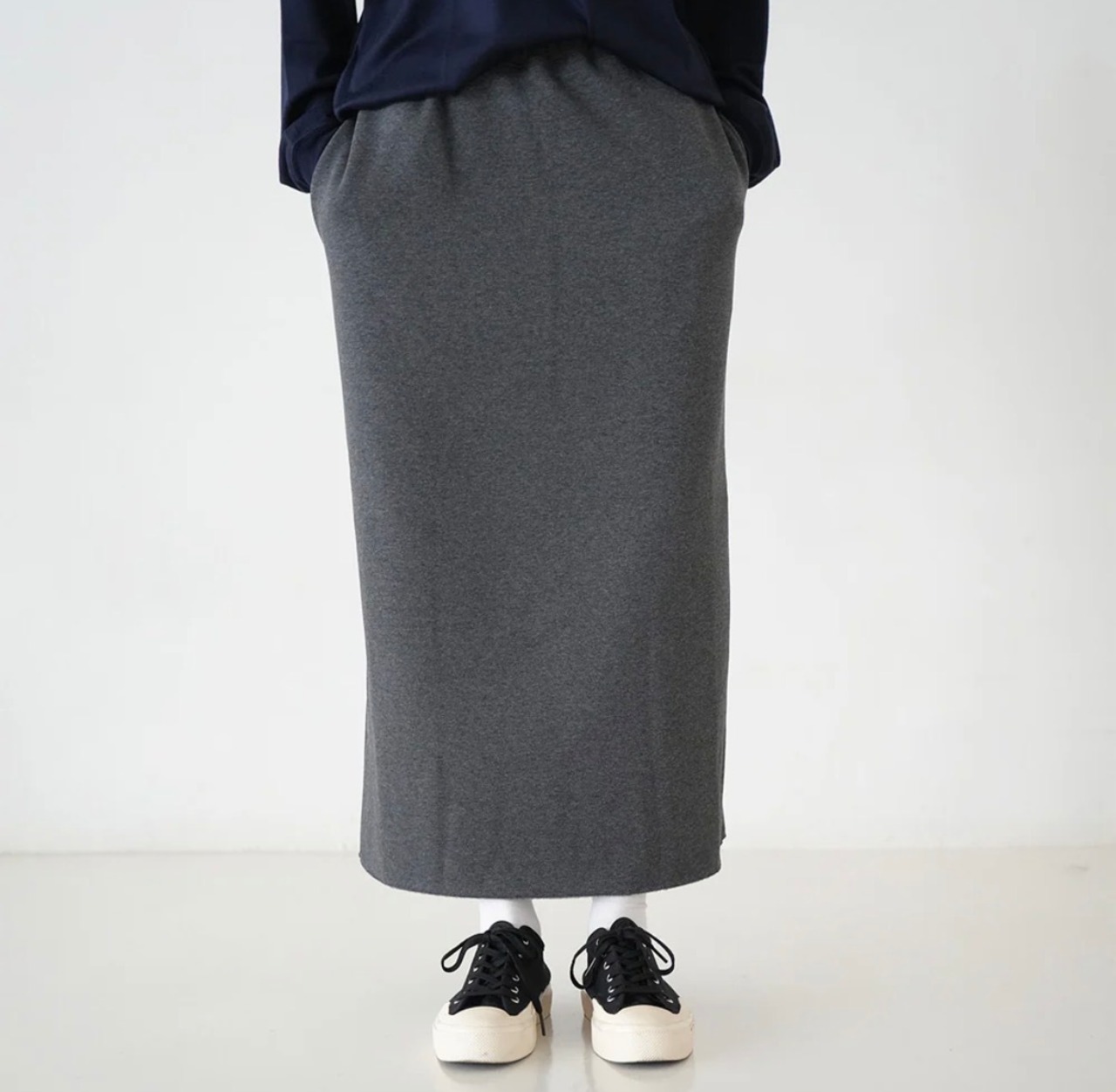 バックスリットで足さばきしやすく、ウエストは総ゴム仕様で生地にも伸縮性があるのでリラクシーな着心地。