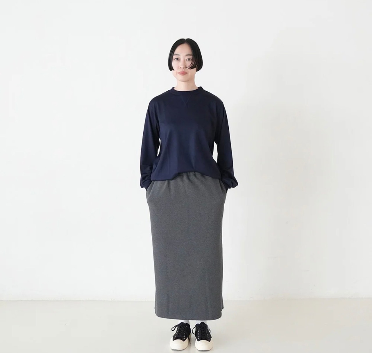 トップスとのバランスが取りやすいタイトなデザインなので幅広く着まわせます。