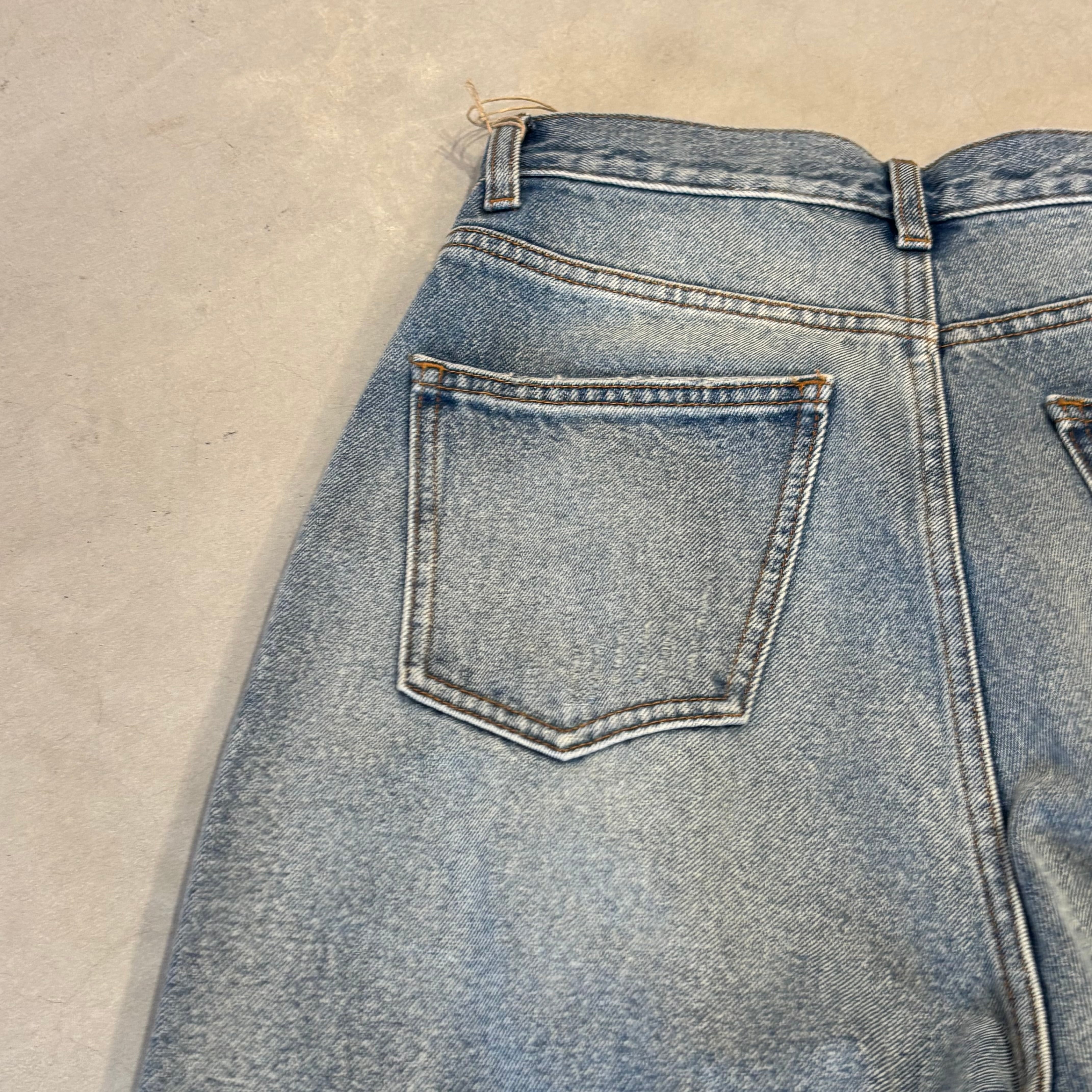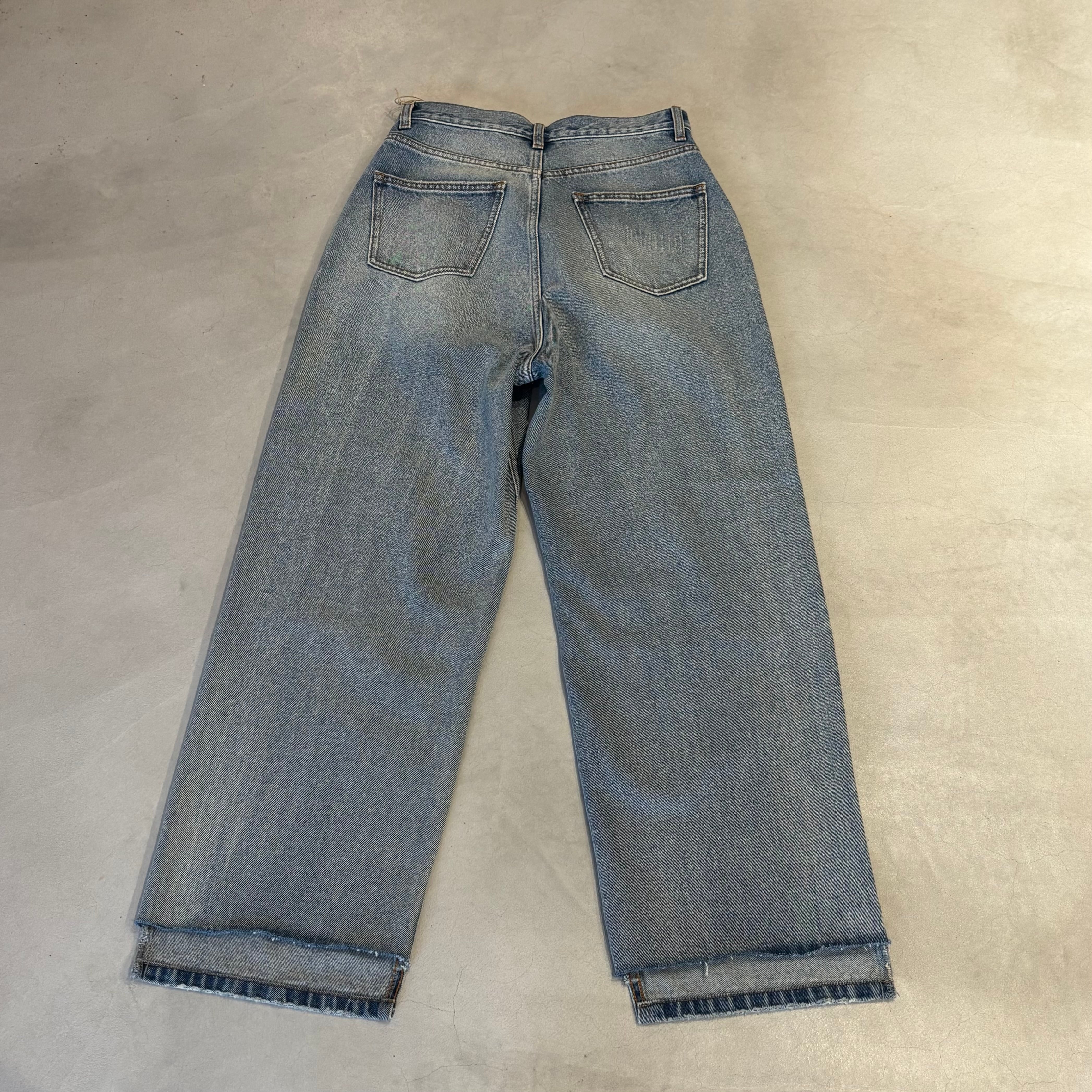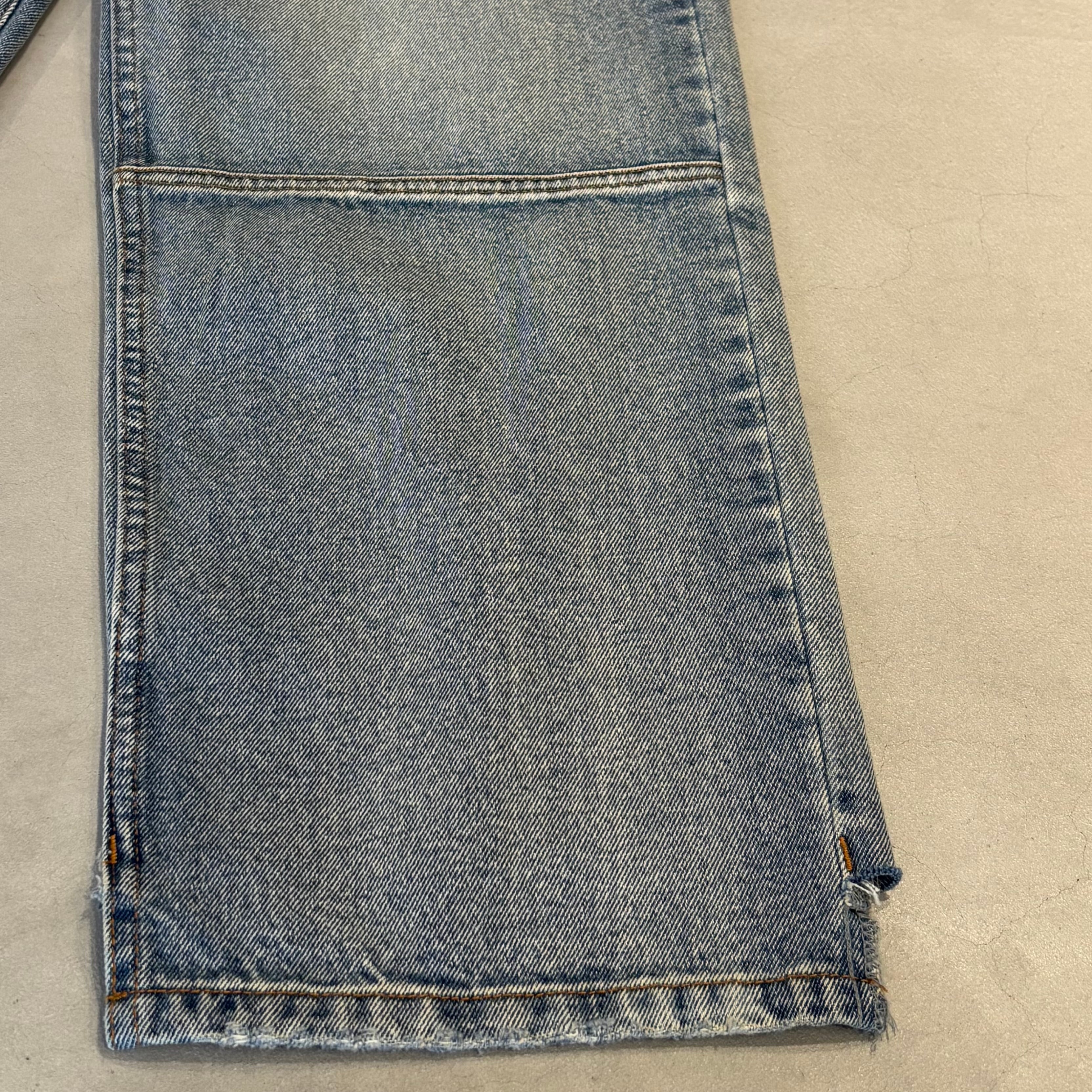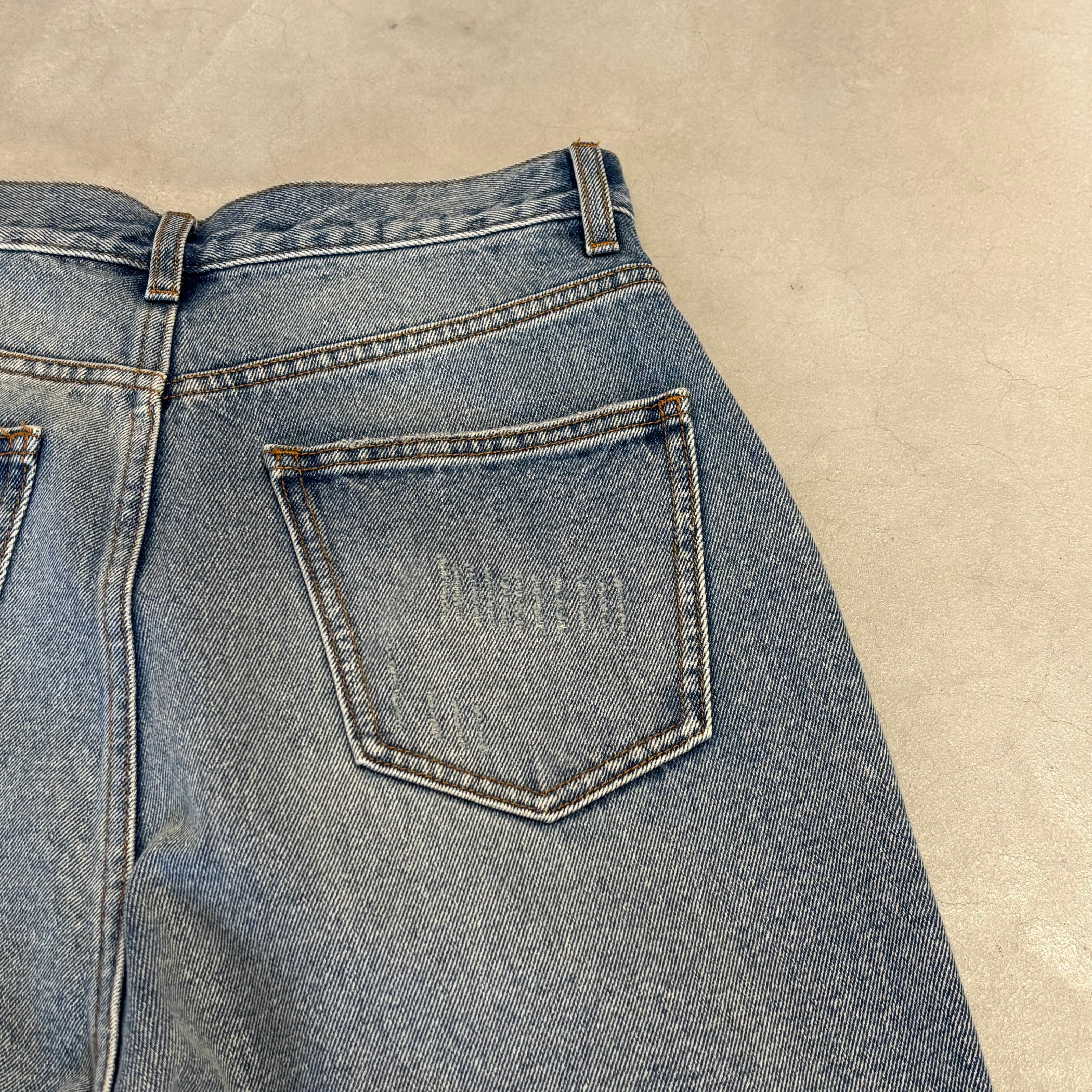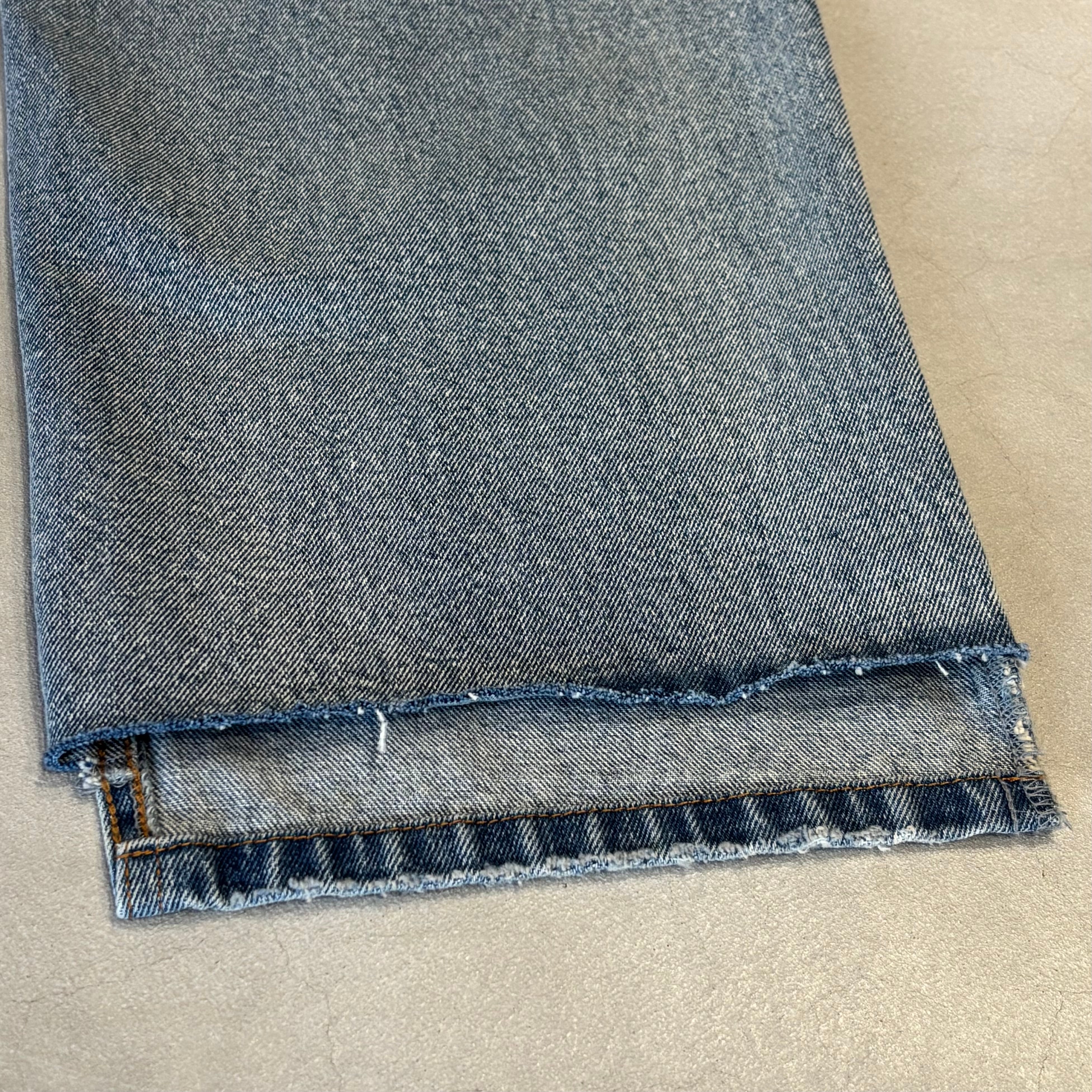 こちらの商品は独特な色目(風合い)を出す為特殊な加工をしております。1点1点多少の表情(色合い・色のムラ・ダメージ・サイズ)が異なります。デニム素材の特性上、着用の際の摩擦や汗により、色落ちや色移りする可能性がありますのでご注意ください。