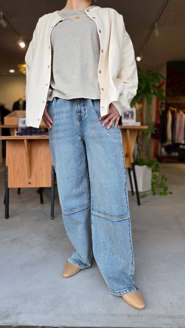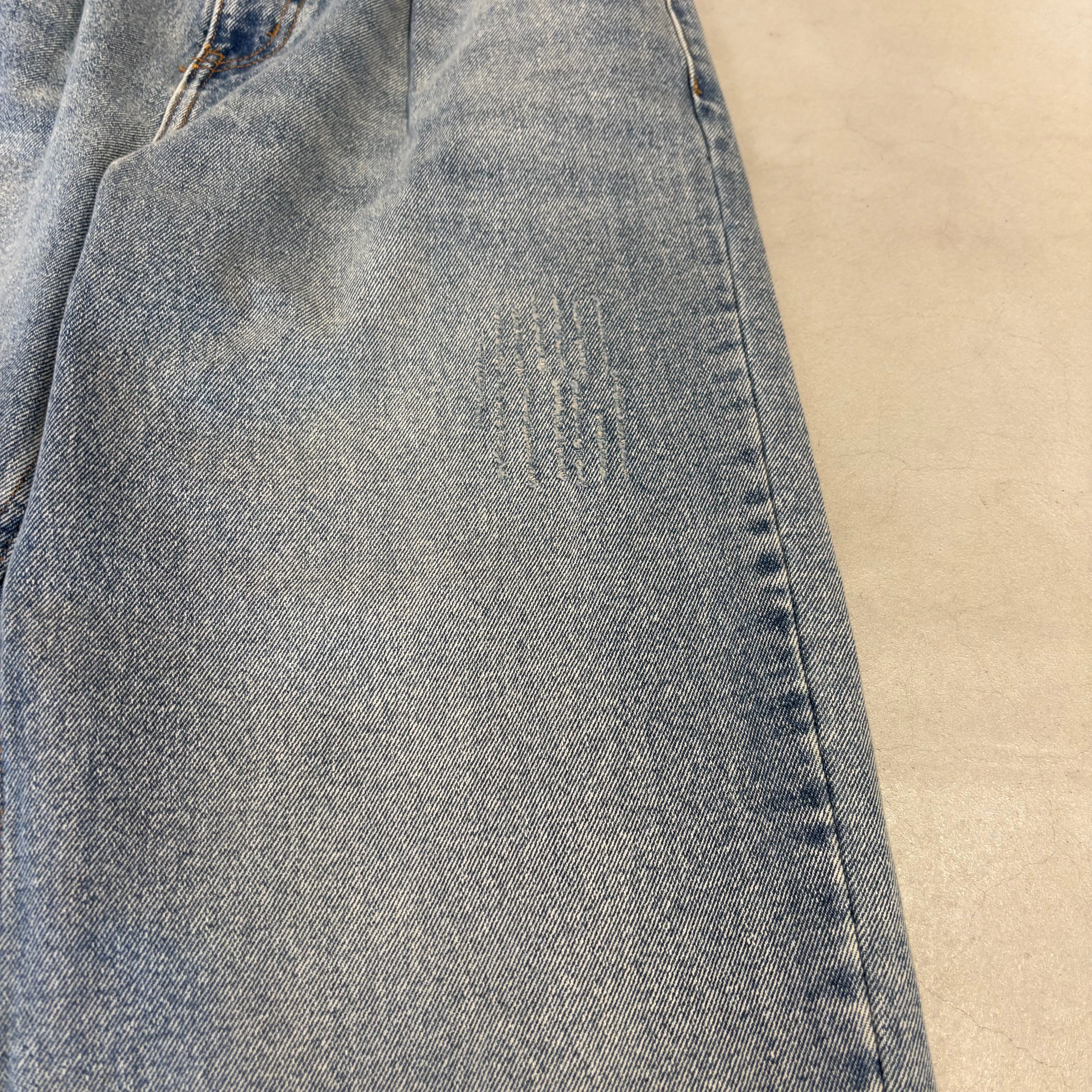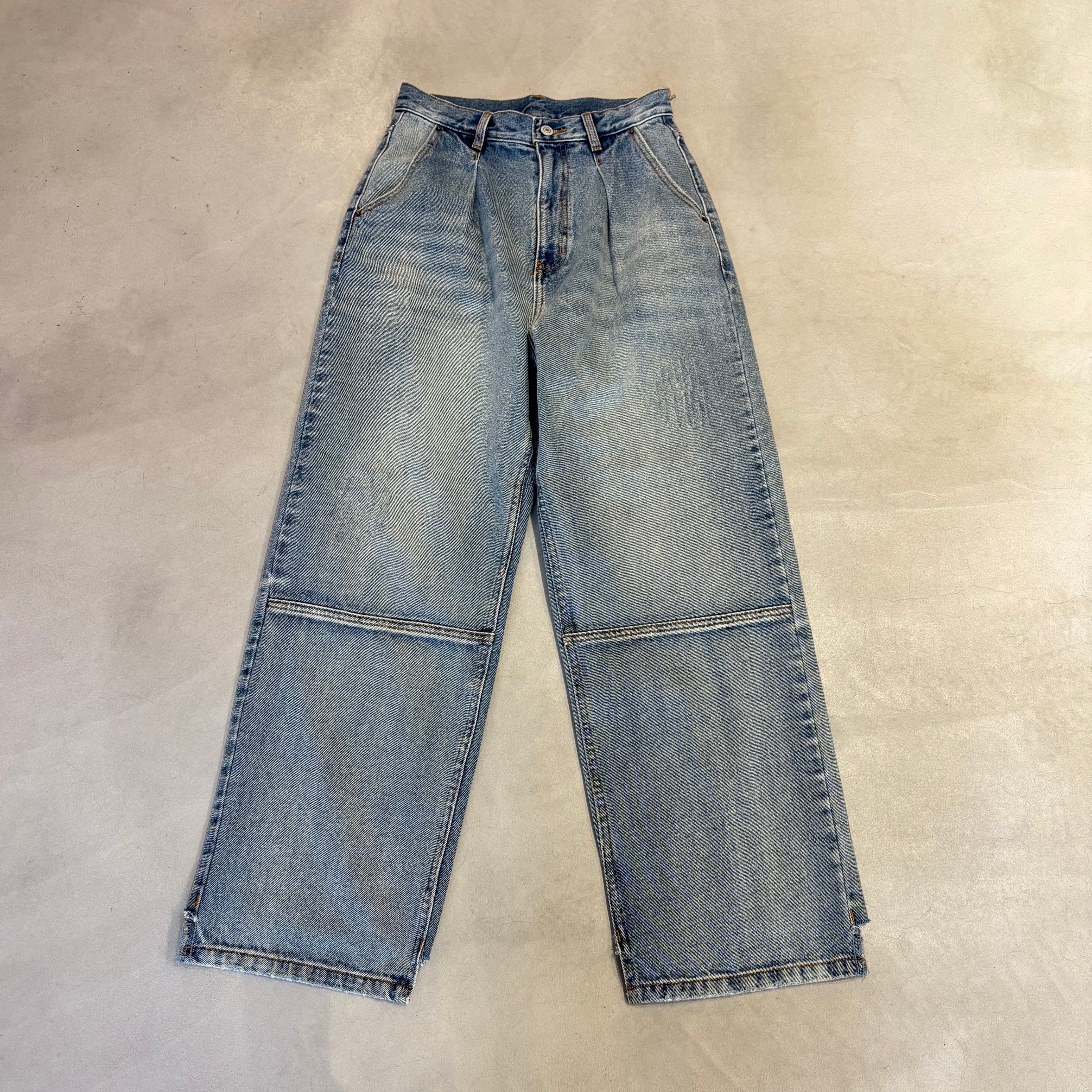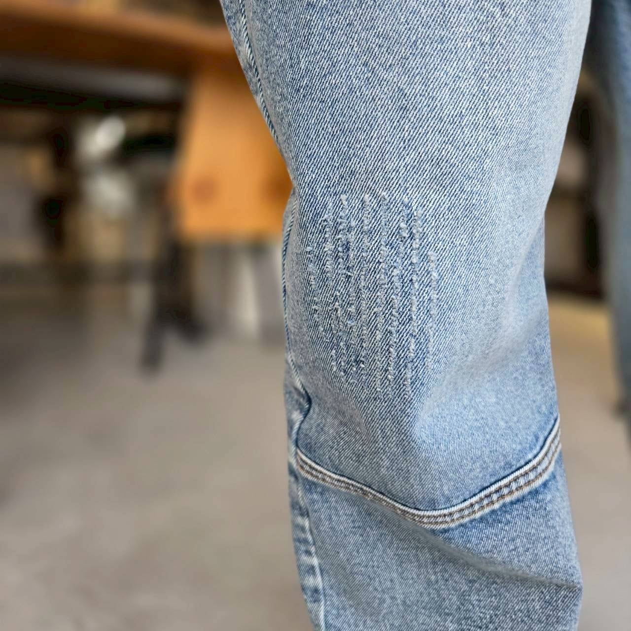 膝下にいれた切り替えデザインや、ところどことに施したさりげないダメージ加工など、こだわりのつまった1枚です。