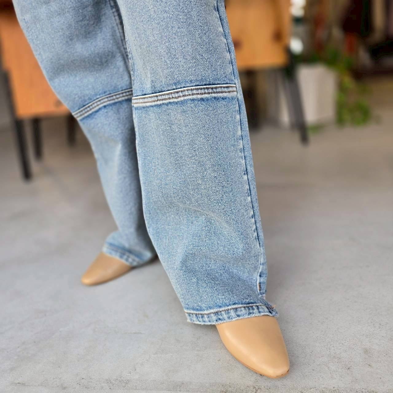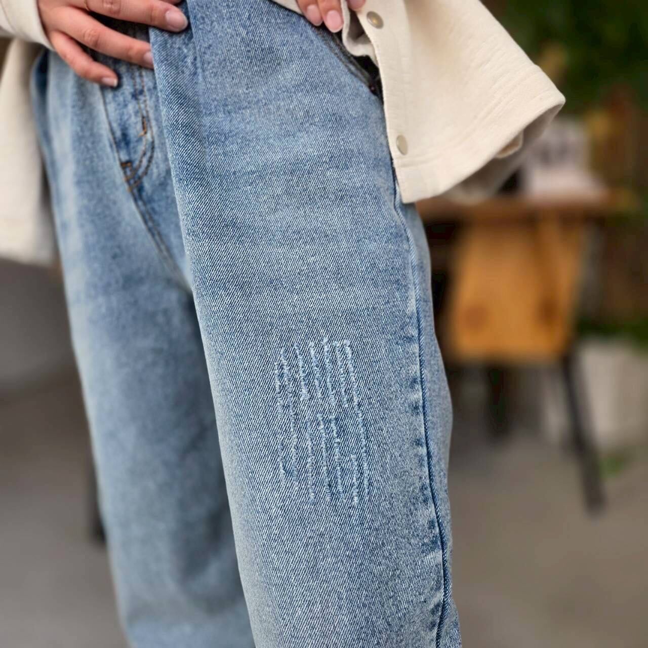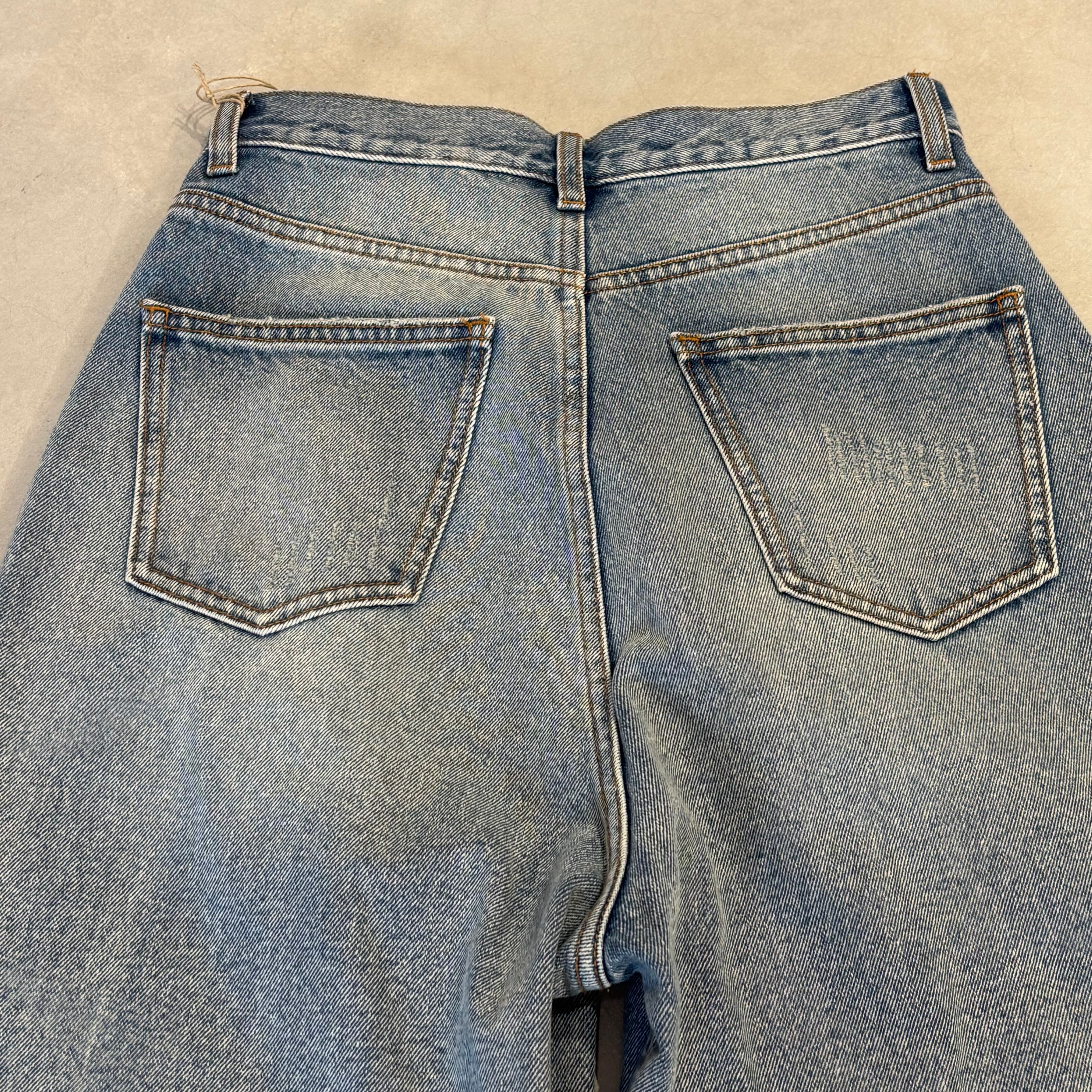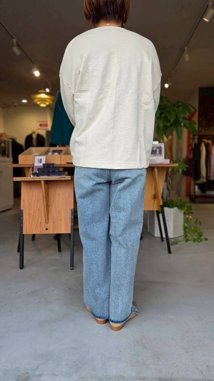 膝下にいれた切り替えデザインや、ところどことに施したさりげないダメージ加工など、こだわりのつまった1枚です。