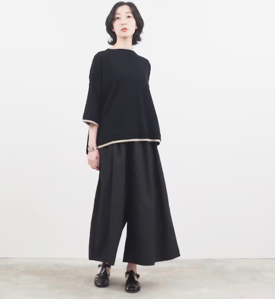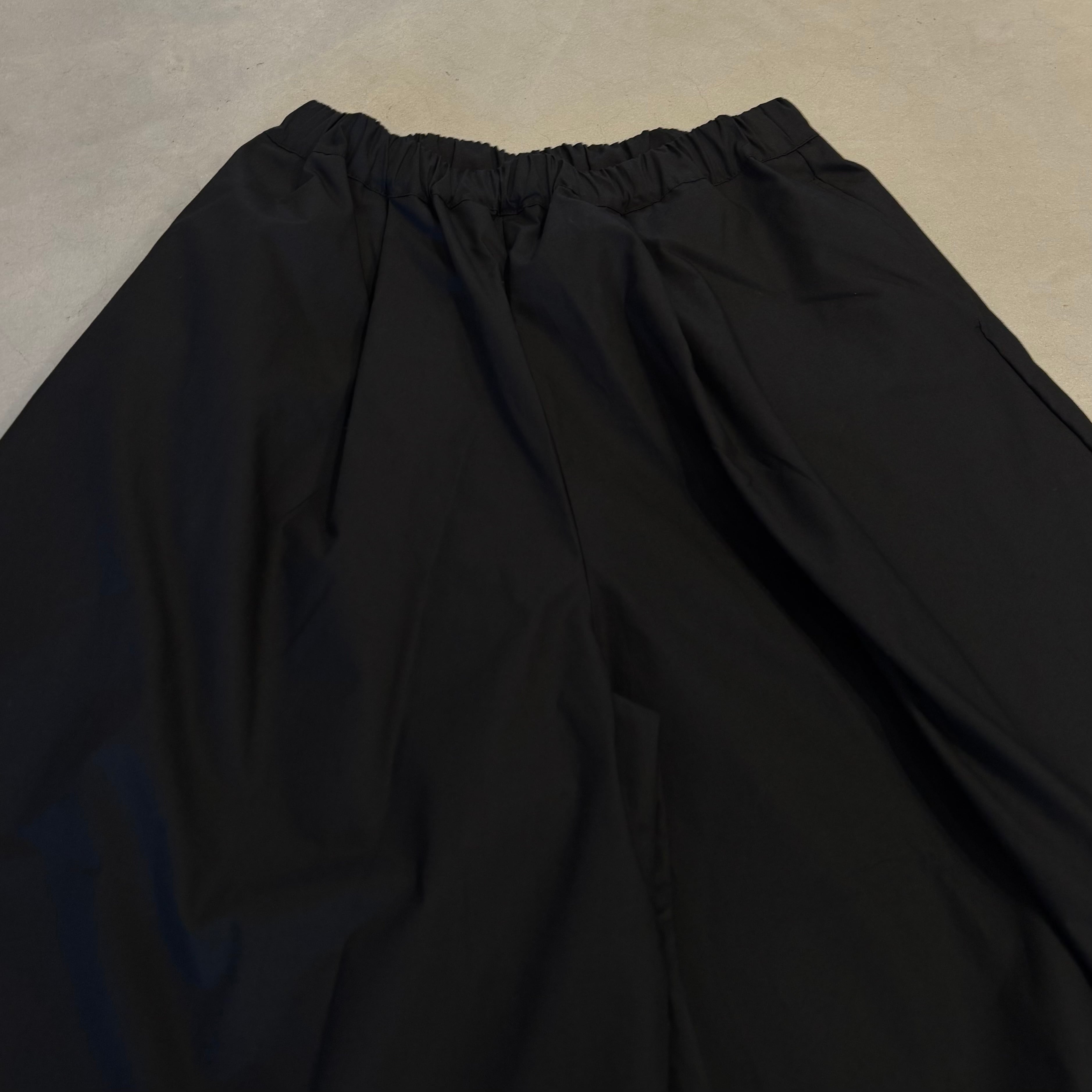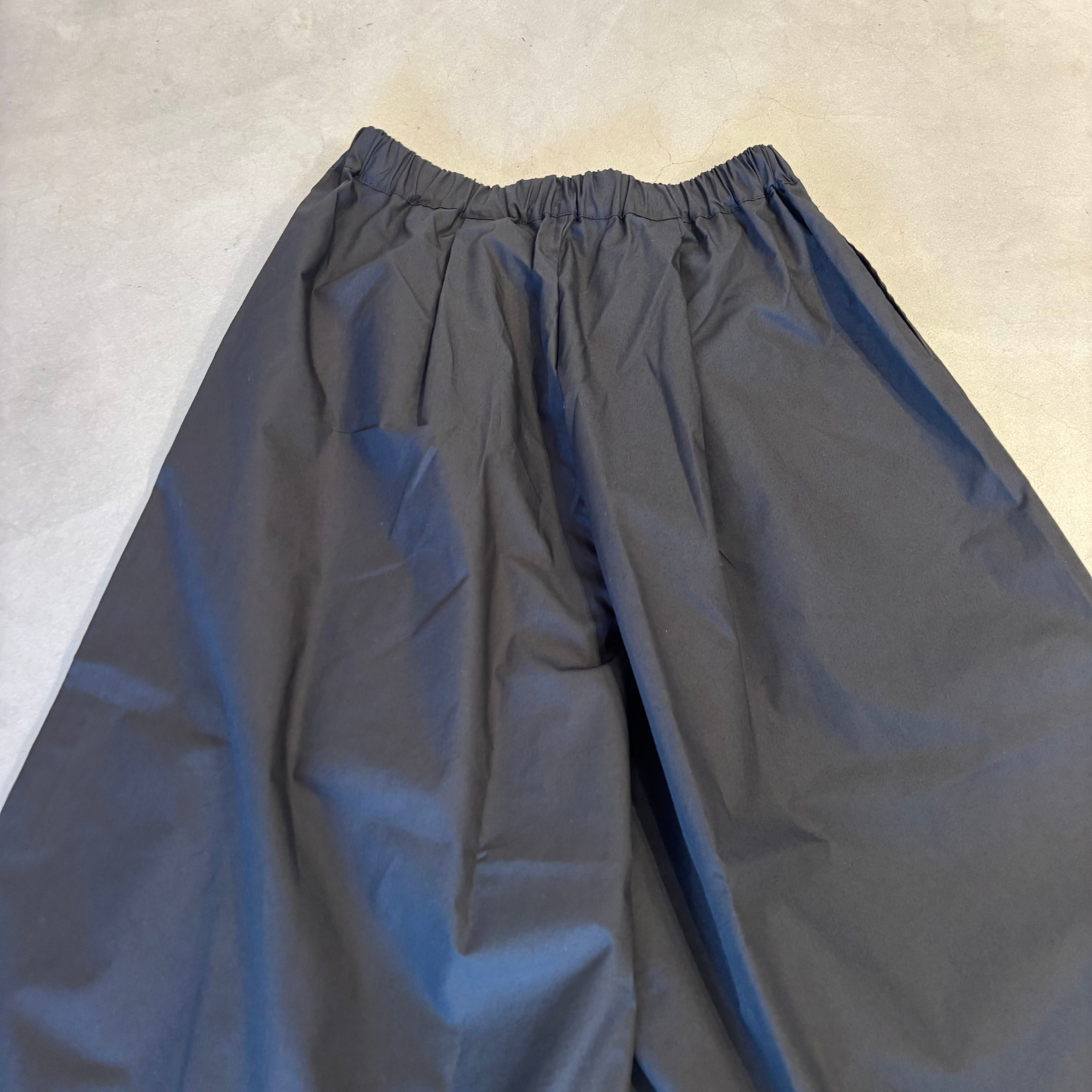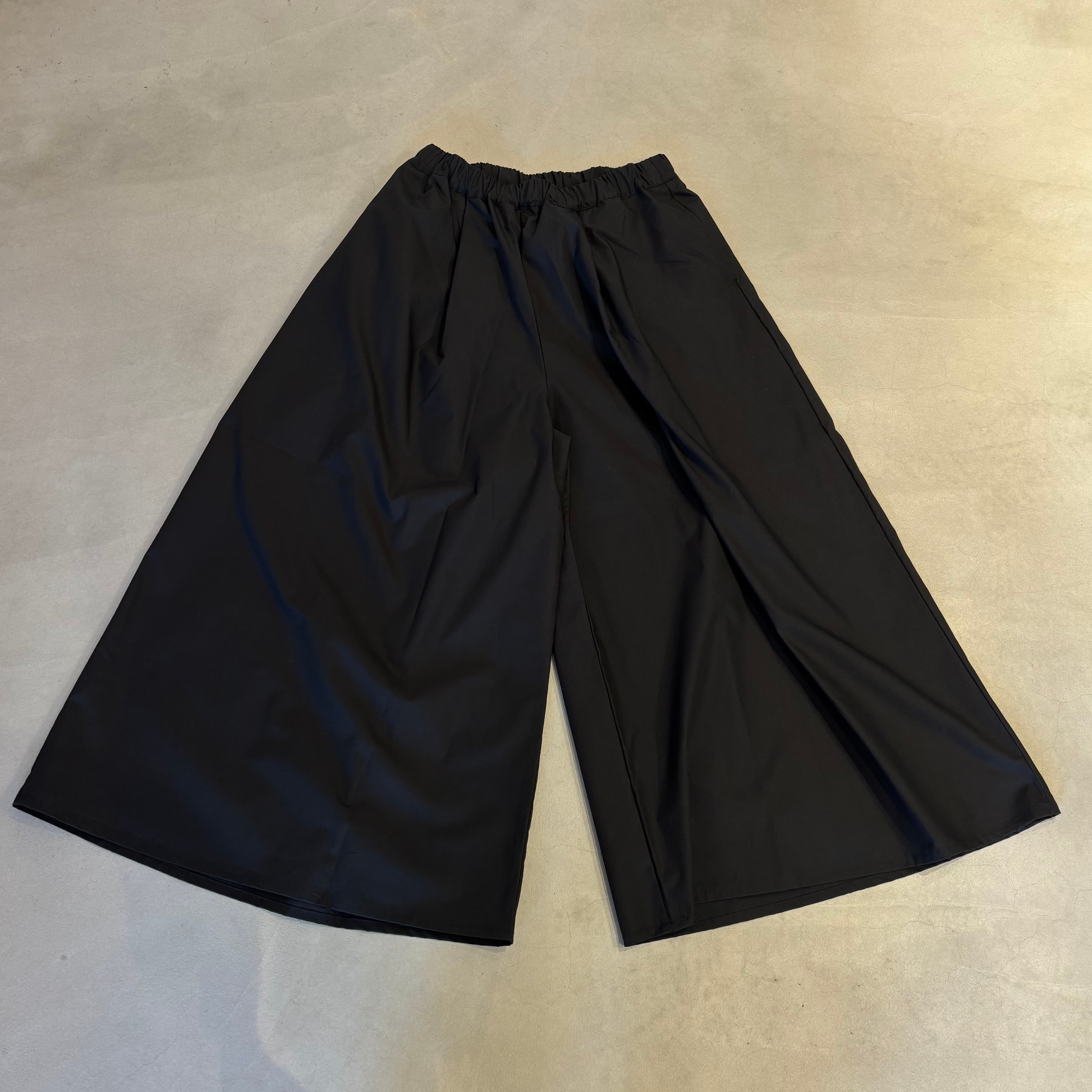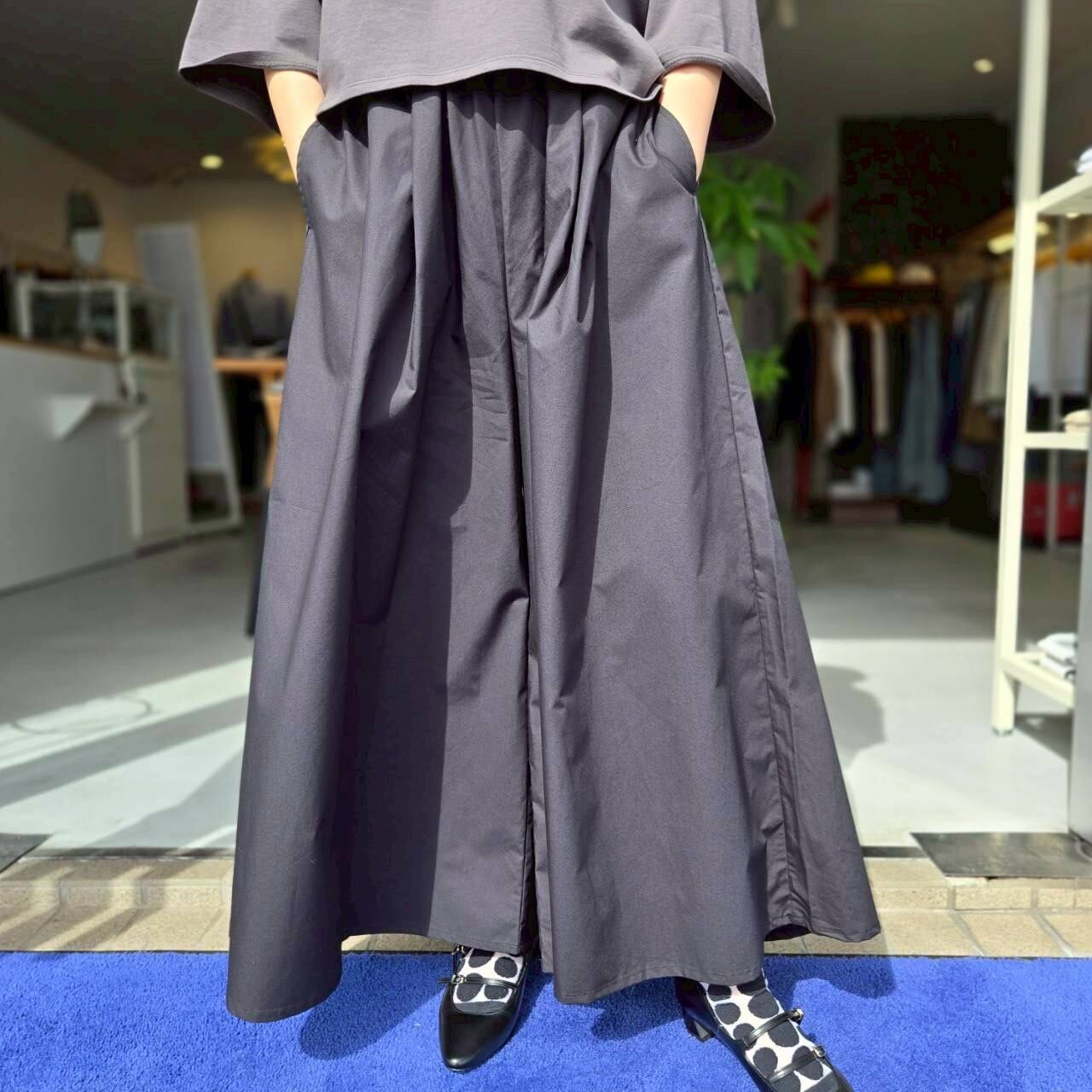 軽くてハリコシのある50タイプライター スカートパンツです。クリアな表面感のタイプライター素材で、軽くてハリコシがあり、クリアな表面感です。カジュアルにもきれいめにもマッチします。前後の2か所ずつのタックとワイドなわたりと裾の広がりでまるでスカートのようにも見えるパンツです。