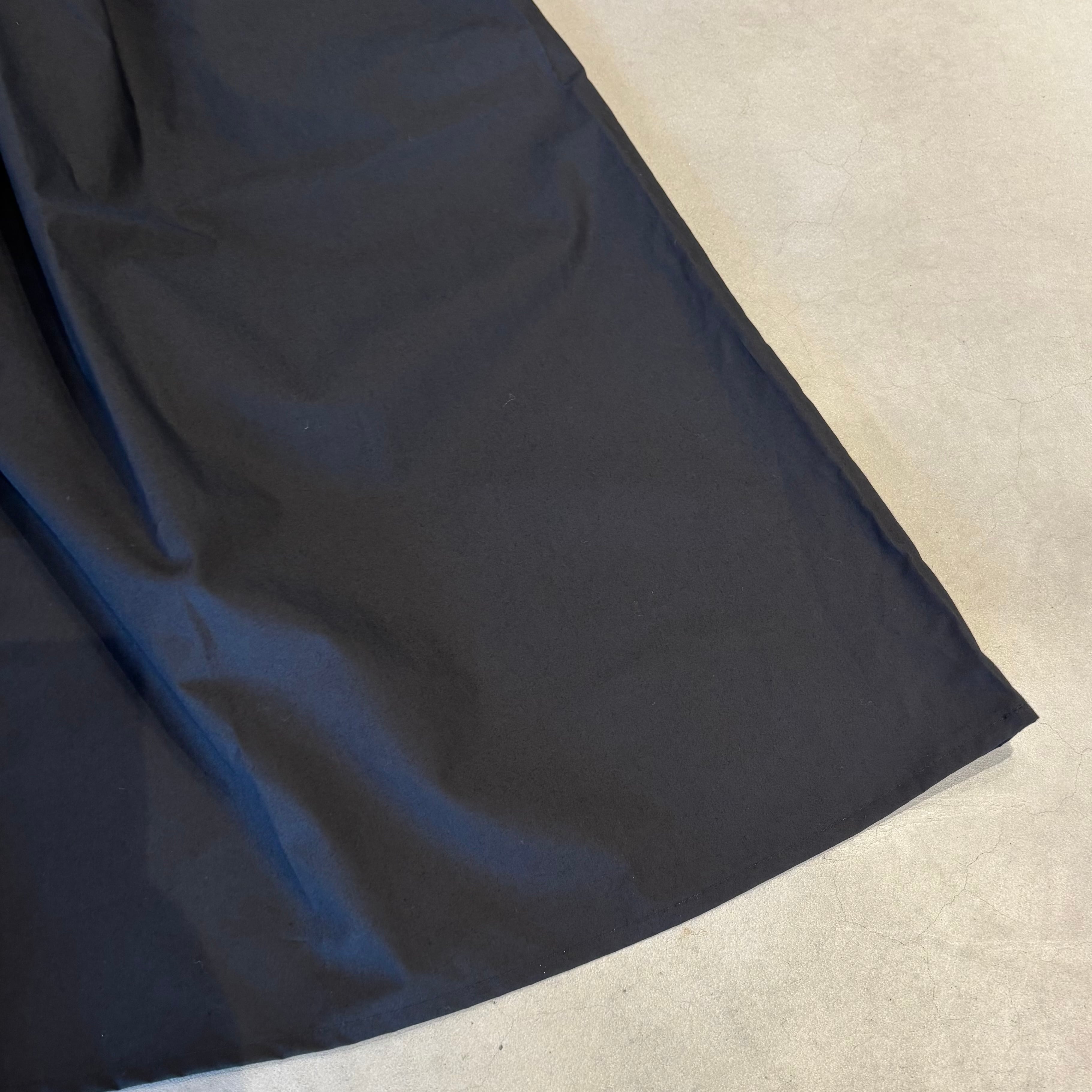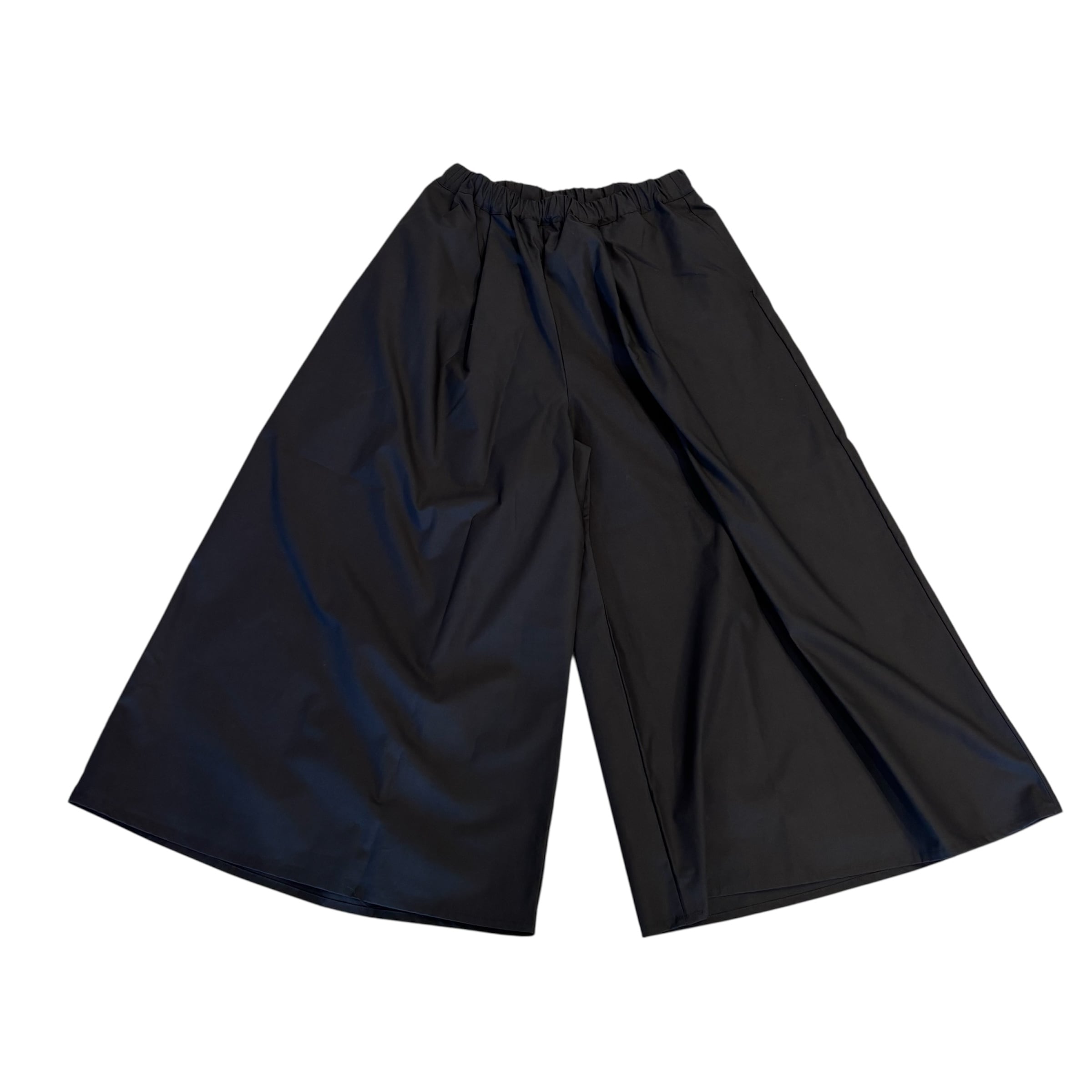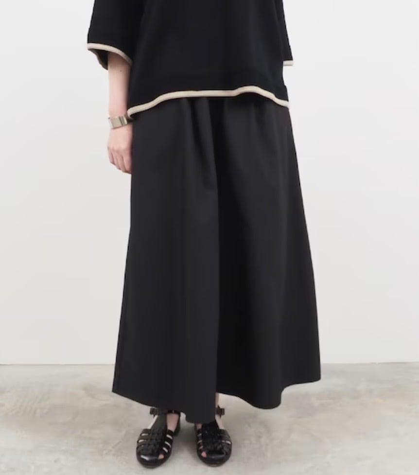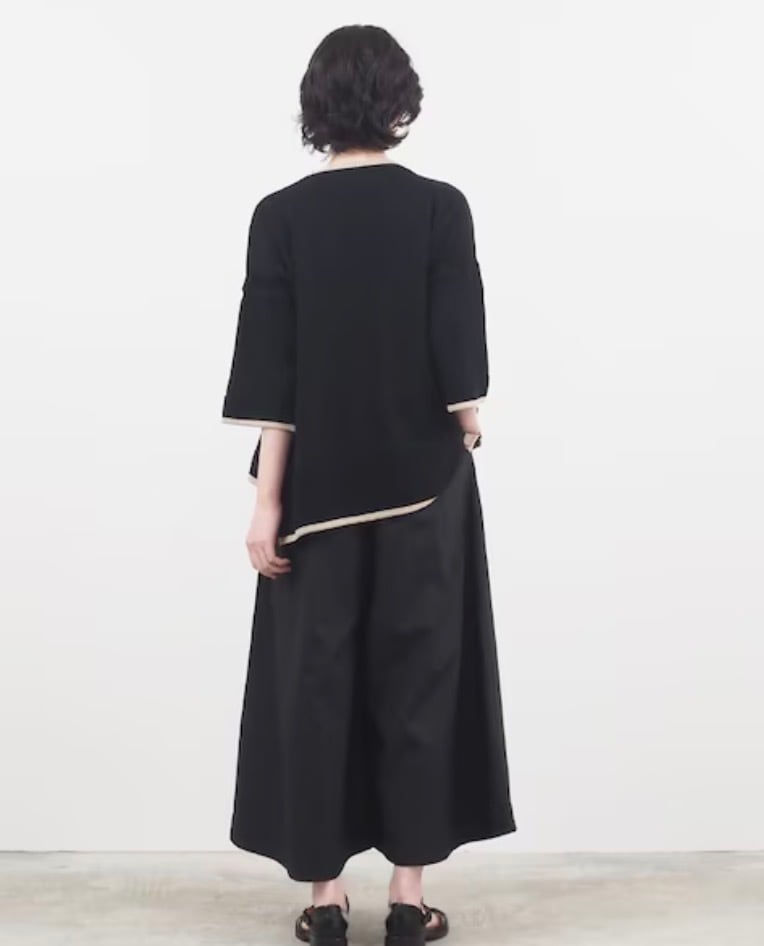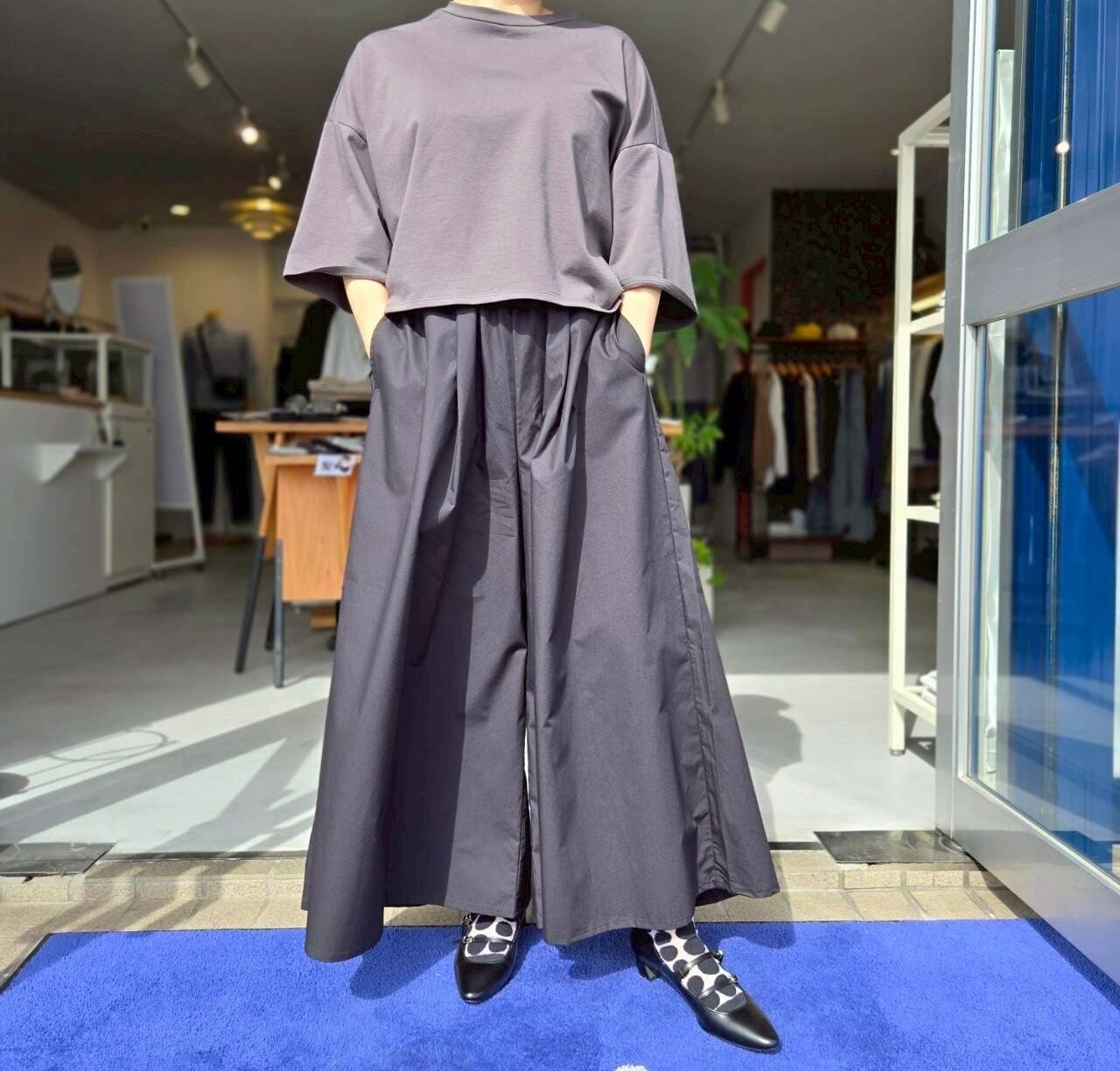 軽くてハリコシのある50タイプライター スカートパンツです。クリアな表面感のタイプライター素材で、軽くてハリコシがあり、クリアな表面感です。カジュアルにもきれいめにもマッチします。前後の2か所ずつのタックとワイドなわたりと裾の広がりでまるでスカートのようにも見えるパンツです。