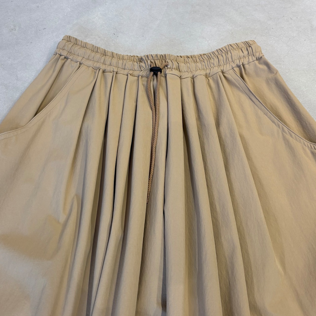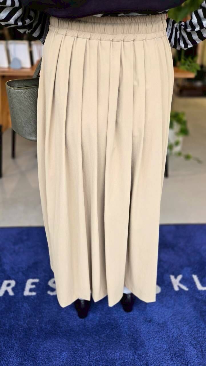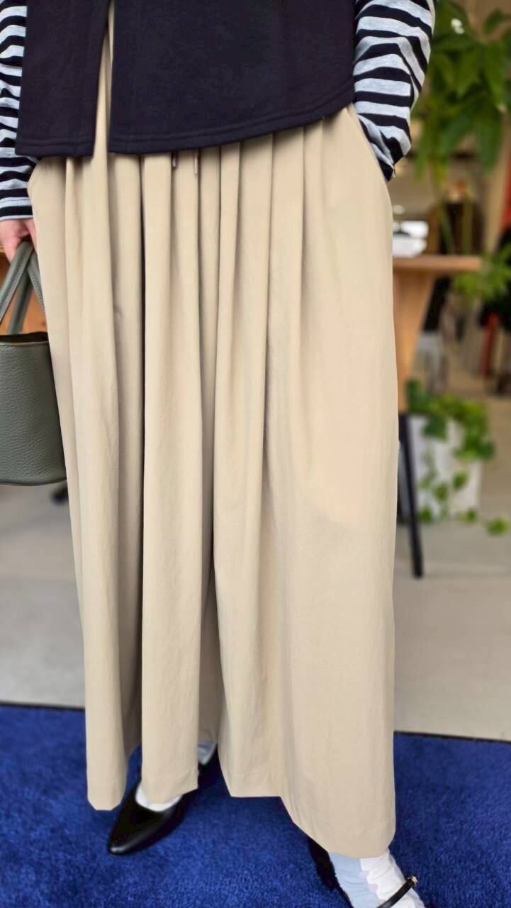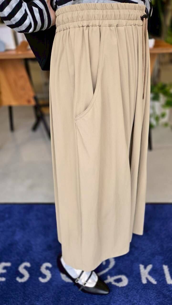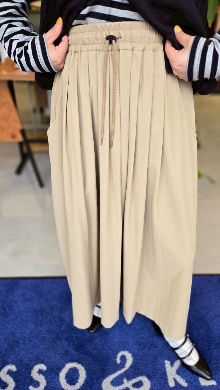 ウエストゴムとスピンドル+ストッパー付きのタックスカート。