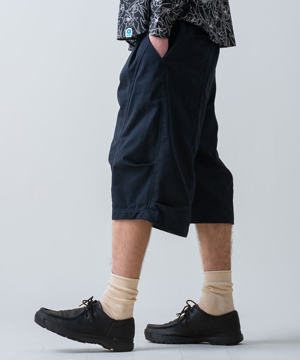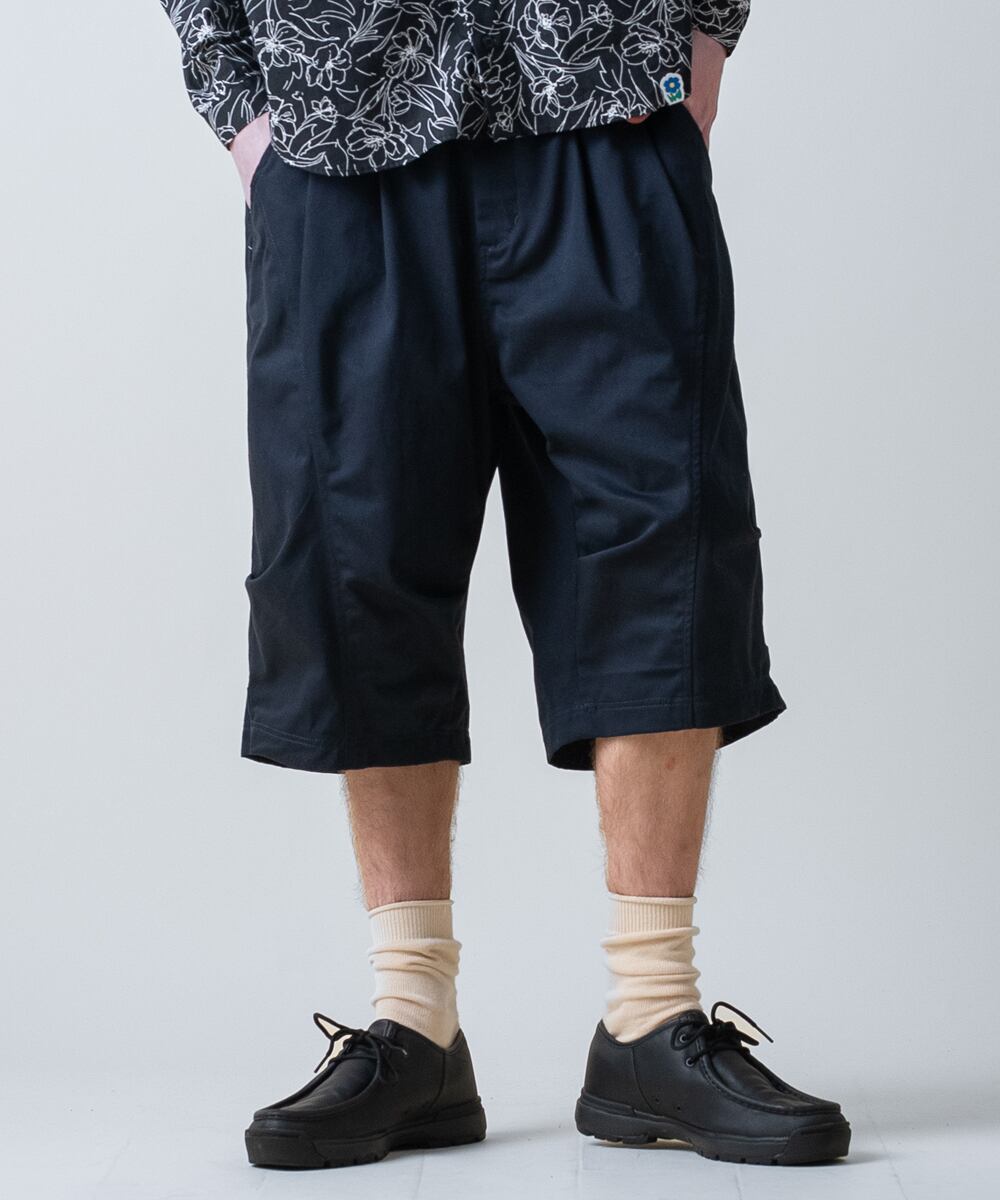 ソロテックスツイルを採用した、ミリタリーライクなデザインの タクティカルイージーショーツ です。膝にかかる半端丈のレングスで、リラックスした雰囲気を持ちながら、だらしなく見えない絶妙なバランスに仕上げています。フロントにはタック、サイドにはダーツを配置し、シンプルなショーツとは一線を画す立体的なフォルムを構築。