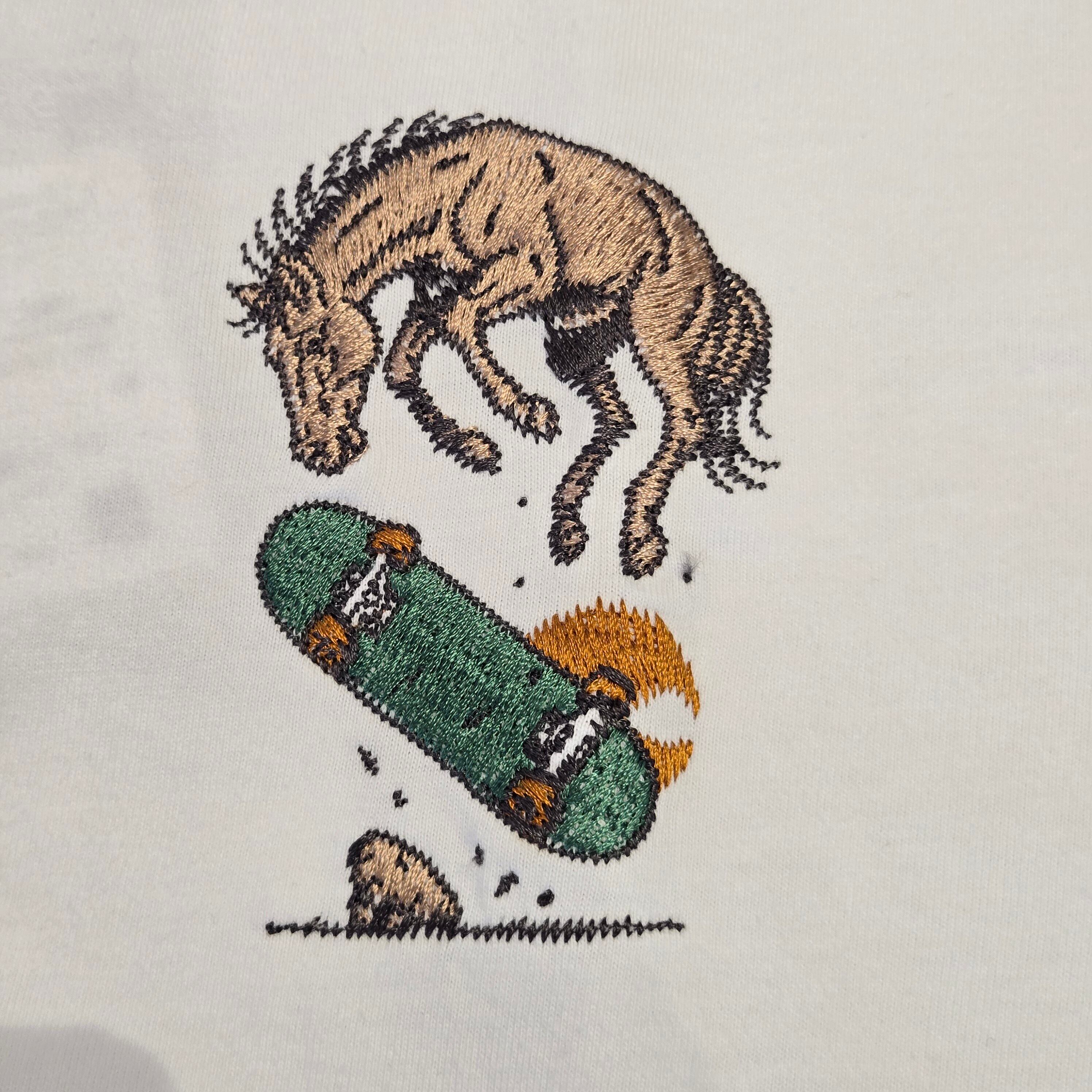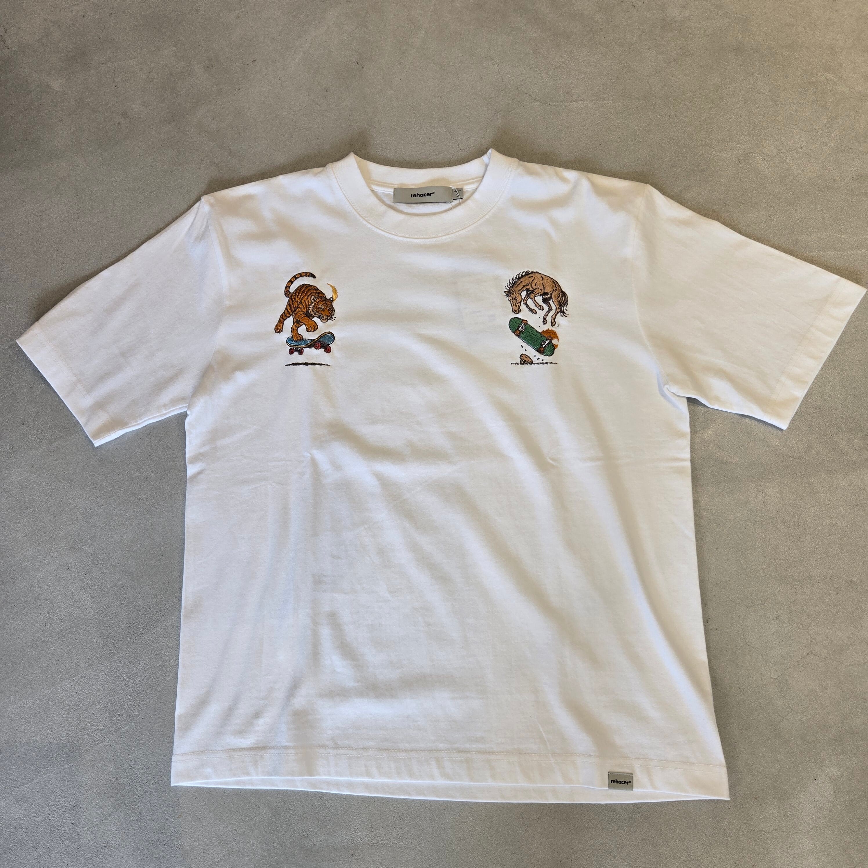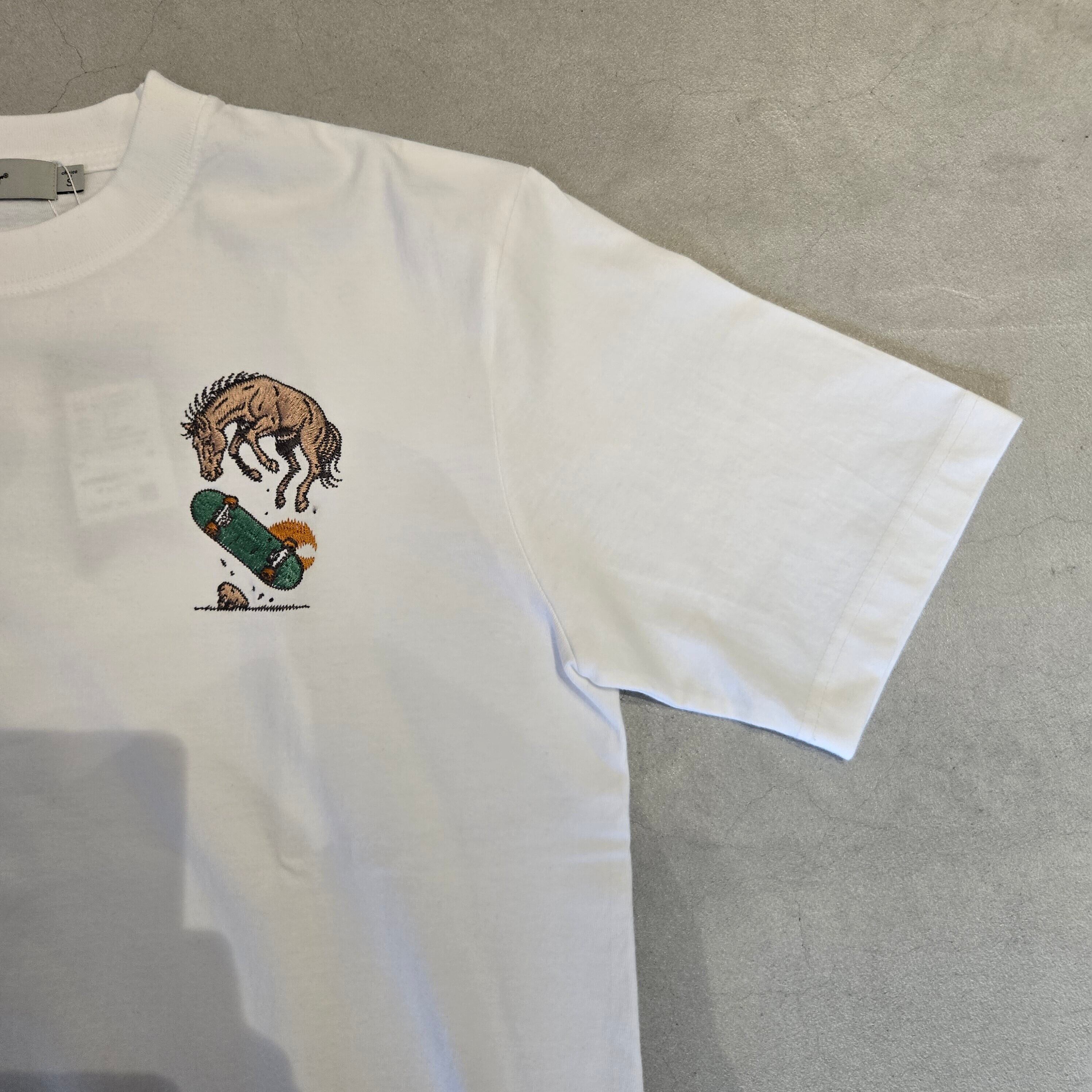 スケートボードに挑む虎と馬をユーモラスに描いた、左右非対称の刺繍が目を引くグラフィックTシャツです。