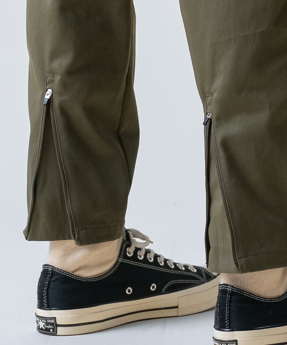 膝にかけて緩やかにカーブし、裾に向かって美しく絞られていく独自のテーパードシルエットが特徴です。さらに裾にはファスナーを搭載しており、開閉によって「テーパード」⇄「ストレート」 の2シルエットを切り替え可能。